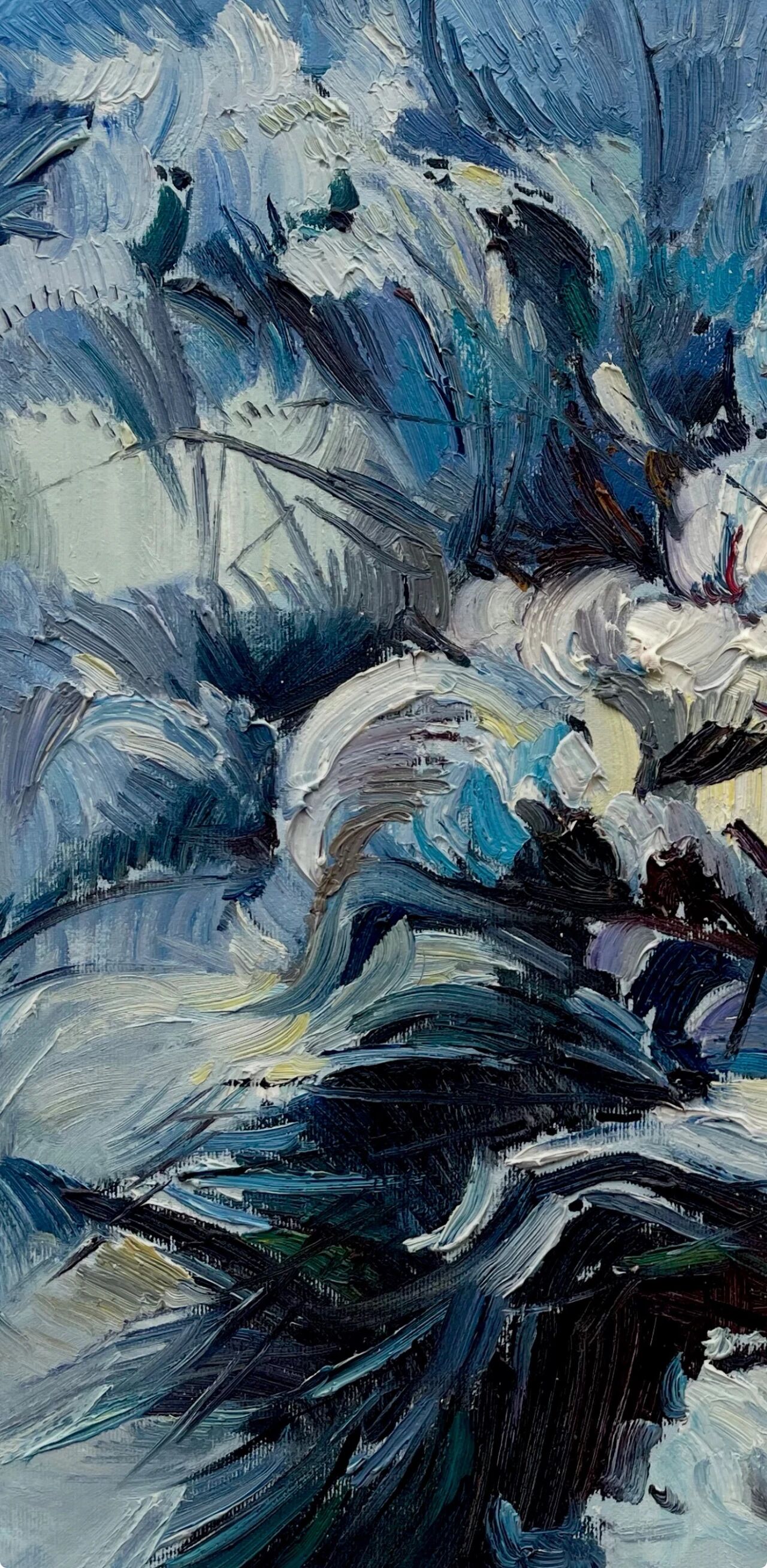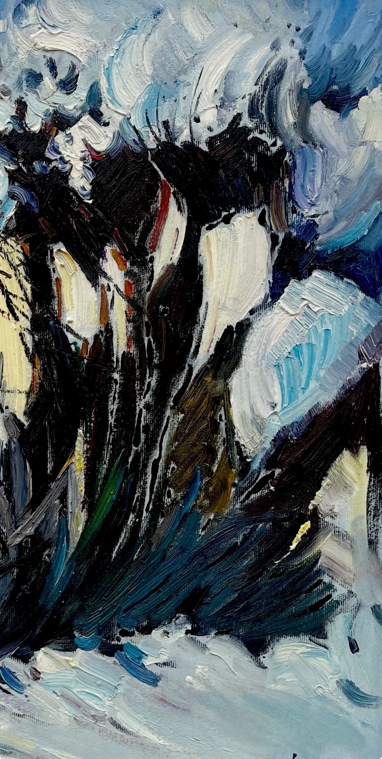 作品構圖獨具巧思,形似孔雀開屏,以羽毛般舒展的筆觸將雪景鋪陳開來。這份構圖設計,既化解了宏大雪景難以具象表達的難題,更暗含著南方人初見雪景時的激動與欣喜。