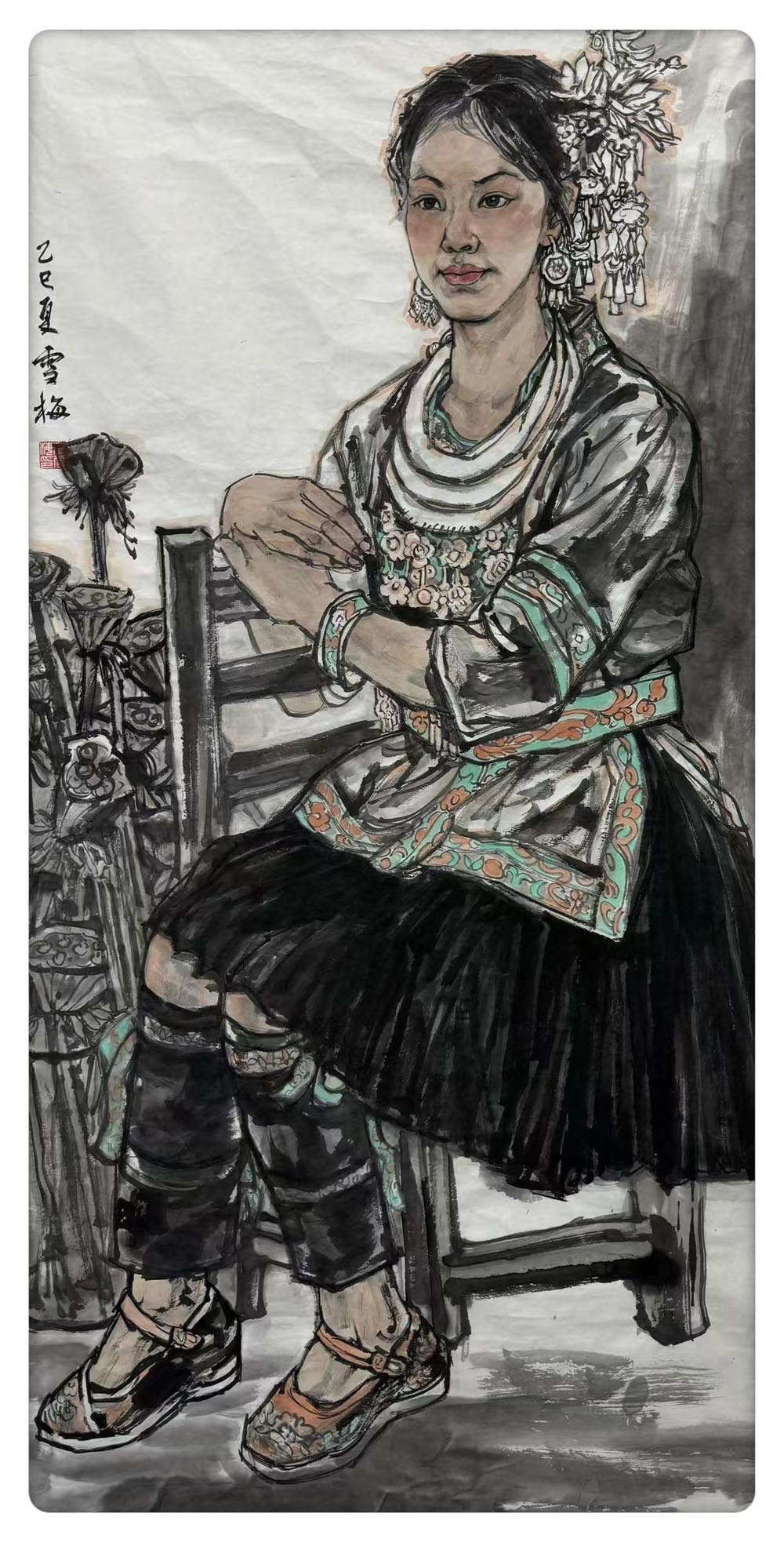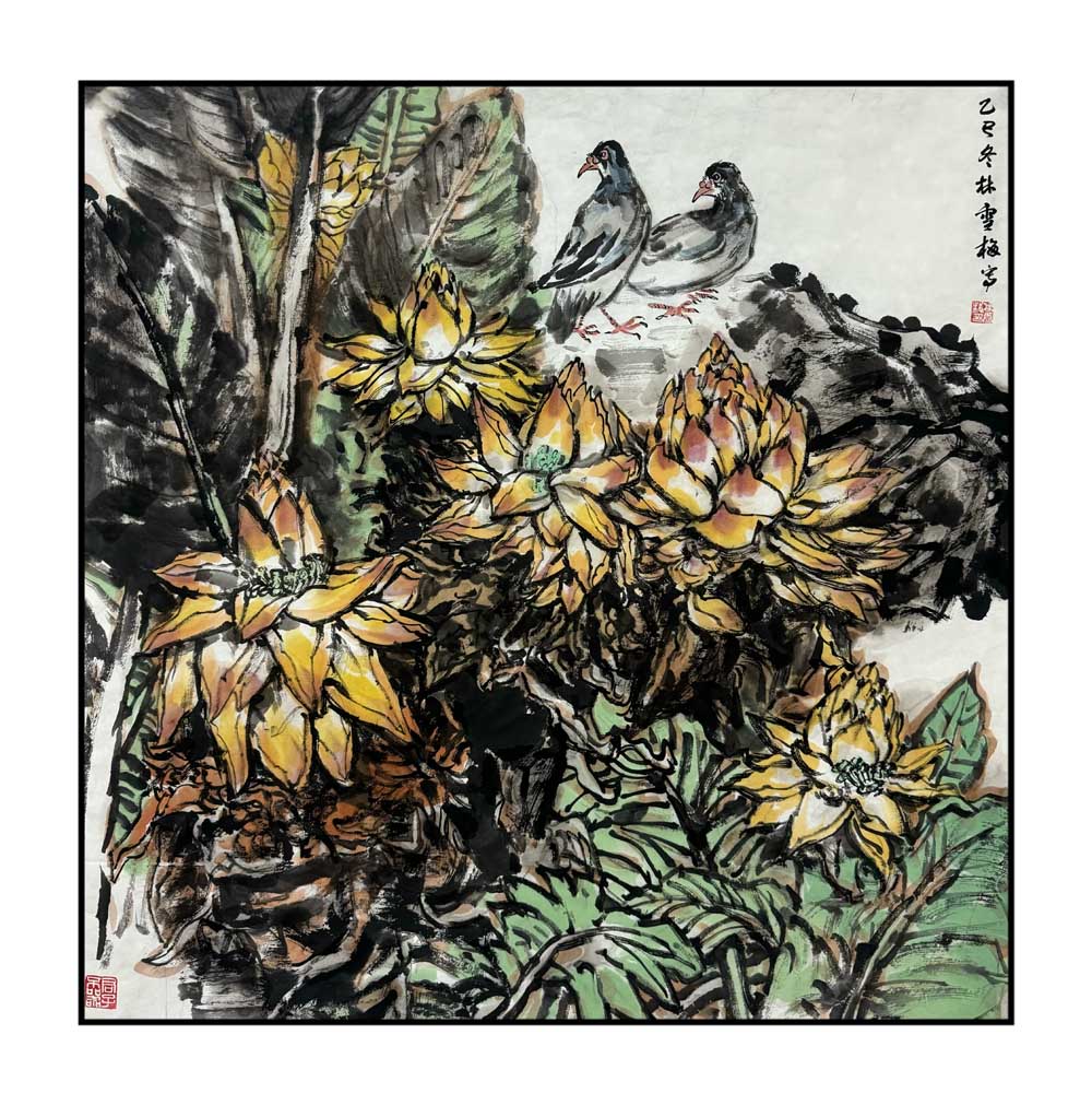在日常創(chuàng)作方面,我始終保持著對繪畫的熱愛與專注。只要有空,我就會走進畫室,與筆墨為伴。一年來,我創(chuàng)作了三幅較大尺寸的中國畫作品,以及多幅六尺、四尺作品,題材涵蓋人物、花鳥、山水。在人物畫中,我嘗試以簡練的筆墨刻畫人物神態(tài),力求在形神兼?zhèn)渲畜w現(xiàn)人物的內(nèi)在情感;在花鳥畫中,我注重筆墨情趣與構(gòu)圖經(jīng)營,追求“以少勝多”的寫意精神;在山水畫中,則更強調(diào)對自然氣韻的把握,用皴、擦、點、染的變化來表現(xiàn)山川的層次與意境。這一系列創(chuàng)作,不僅是數(shù)量上的積累,更是我在筆墨語言與畫面構(gòu)成上不斷探索的過程。