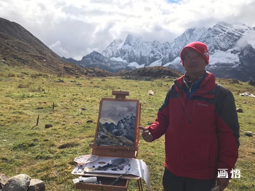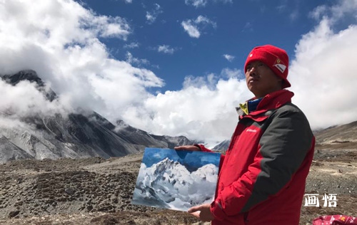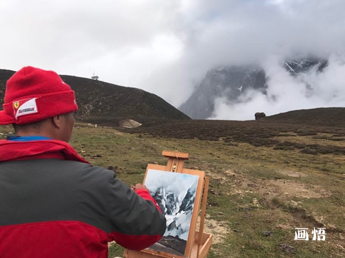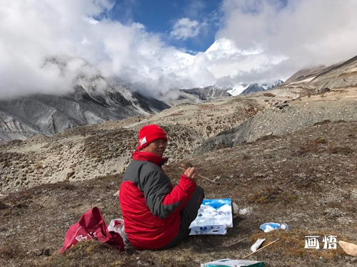 在西藏的文化里有這樣的說法:如果不畏艱辛順著馬卡魯峰、喬穆央宗神山、洛子拉姆神山、珠穆拉瑪神山一路朝拜等于給一次自己重生的機會!因為一路的艱辛會讓一個人從心底產(chǎn)生脫胎換骨的變化!也許是受到這種說法的鼓舞,也許藝術家心里那份對于寫生的執(zhí)著,黃大刀,不畏艱難、不懼嚴寒,毅然開啟了雪山寫生之旅。