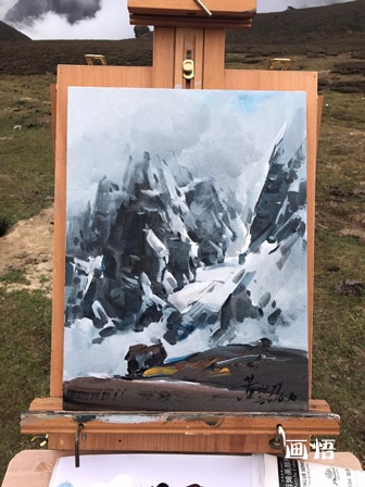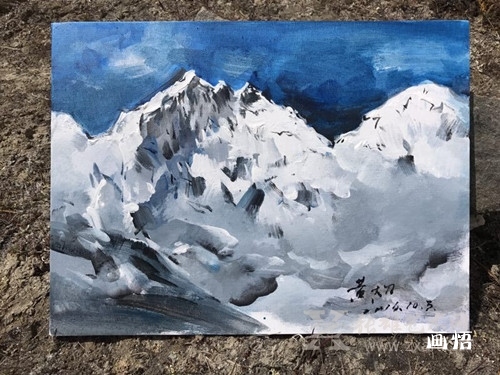 對于畫家來說,寫生是他們創(chuàng)作的一部分,畫家們經(jīng)常都會外出寫生,但是卻鮮有畫家登上雪山寫生。這是因為登山本就是一件不易的事,更何況是雪山,對于很多畫家來說這十分具有挑戰(zhàn)性。但是黃大刀做到了,憑借著滿腔的熱情,他登上了雪山。世界最美山谷嘎瑪溝、世界級雪山群——日照金山群、湖中倒影都盡收在他的眼底,頗有一覽眾山小之勢。近距離感受珠穆朗瑪峰、洛子峰和馬卡魯峰的風采,更是激發(fā)了他無限的創(chuàng)作靈感。黃大刀是響當當?shù)男袆优桑`感一來,他便找到合適的位置,架起畫板,選擇最佳的視角,投入到認真的繪畫中。
