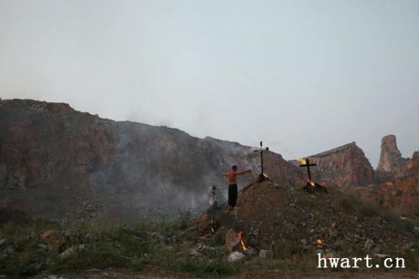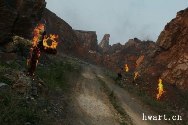 5月27日 2017拖行中國——過火的稻草人策劃:朱新戰(zhàn)學術主持:吳以強攝影師:李成虎、李樹輝、王志強協(xié)助拍攝:張光明、李偉群里有關人的動物性有討論,人何以稱謂高級動物,眾說紛紜。我記得王德仁說過,火的使用讓人類可以驅寒保暖,擴大了食物范圍,保障了食品安全,也延長了生命時間,促成了大腦的發(fā)育。我也聽王德仁說過“火”作為上天的恩賜,一直為人類所敬畏。火的使用使得人類從低級轉向高級,成為地球的主人。祭禮中火的使用是凈化與升華的寓意,回向太陽光明神。河南朱新戰(zhàn)點燃了“稻草人”。他把秸稈捆扎的十字架立在田野,空空的座椅守望著麥田,稻草人的沉思還沒結束,朱新戰(zhàn)已經(jīng)把稻草人置于荒山野嶺獻祭給太陽光明神了!宗教預言2012的世界末日,各大宗教并未做末日回應,審判缺席!那是有意思的一年,世界各地的人們在惶恐中多少都有了墮落的欲念,人性和神性的思維最最頻繁的一年。王德仁做了祭禮謝萬罪,開始批判所有宗教。他很好地解釋了末日:人類進入另一周期,新紀元開始了。他的闡釋讓所有宗教都有了臺階,王德仁上,他們下。朱新戰(zhàn)讓“稻草人”做了火祭。百度“火燒十字架”,頁面全是電玩游戲的內容,王德仁說:燒十字架是針對宗教的普遍行為……不過燒“稻草人十字架”就必須深刻反思!濃煙滾滾,火焰燃過之后,過火的十字架顯露出來。不清楚朱新戰(zhàn)在毀滅的火光中得到了什么樣的啟示,也不清楚余煙裊裊的十字架在神學、宗教人士及非信眾心里投射了什么。據(jù)現(xiàn)場的攝影師說,朱新戰(zhàn)身后的煙霧中有靈異身形出現(xiàn)。火祭禮真能潔凈人類不潔么?“稻草人”之火是通往審判路上的臺階,還是截斷了贖罪的道路?吳以強