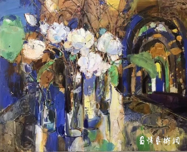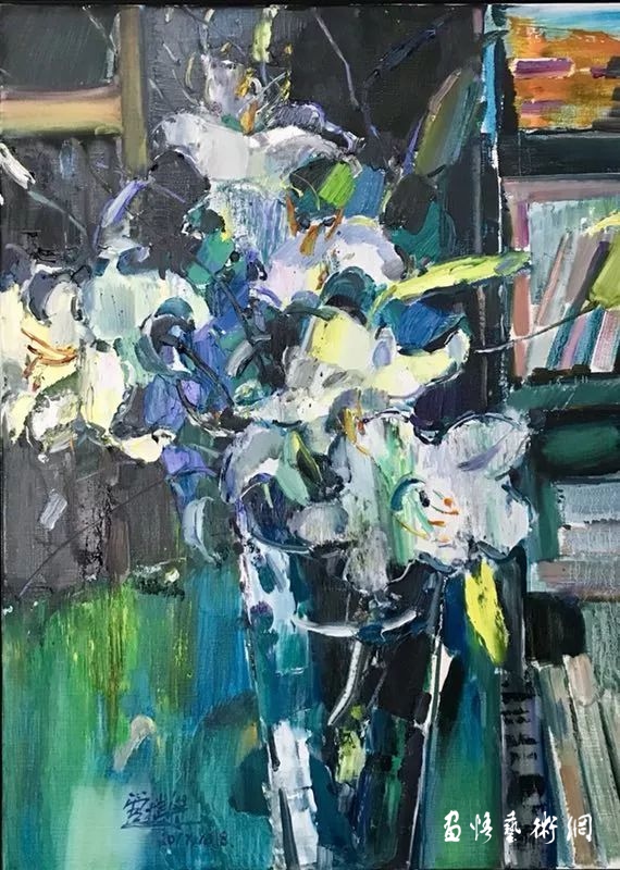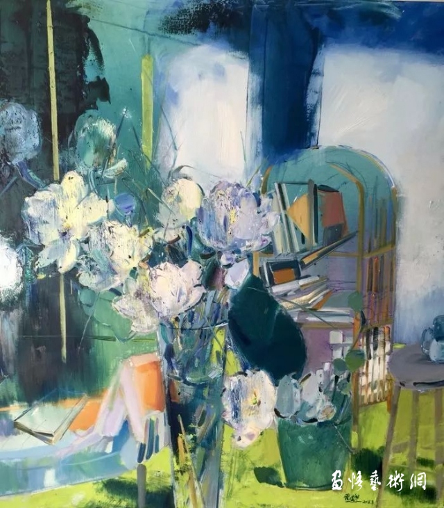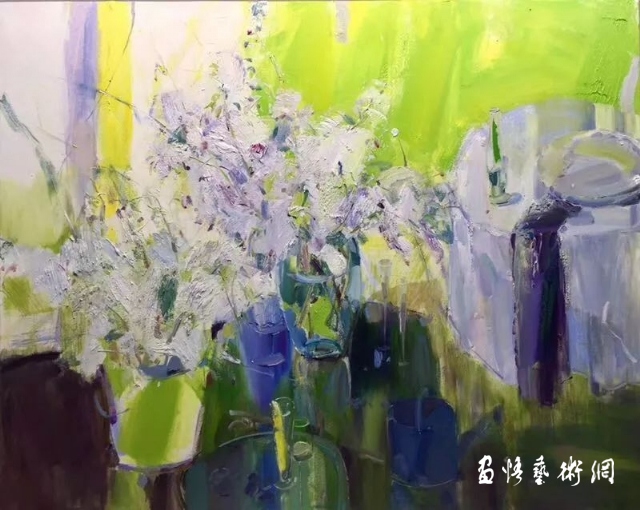管樸學的靜物畫,跳出了一般靜物畫再現(xiàn)物件的靜態(tài)之美。她似乎并不在乎畫的是什么花,用的是那種器皿,只在乎這些實物,在“光”這位魔術(shù)師的導演中,舞動著、跳躍著、閃爍著,此時此刻在交錯變化的時空中,樸朔迷離的幻影中,是開啟了她人生體驗的感悟,還是觸動了她的某種情感的琴弦,給了她倏忽而來的靈感。讓她迫不及待地揮舞畫筆,飽蘸著情感的色彩,滿懷激情,去營造心中的美麗圖景。她舍去造型中理性的透視規(guī)則,用平面構(gòu)成,隨著心脈的搏動,情感的起伏,痛快淋漓地將色彩的色相、明度,冷暖的差異,構(gòu)成了畫面的基調(diào)。她并不表現(xiàn)器物的質(zhì)感和體量感,來自物體自身的的光,來自結(jié)構(gòu)的光,通過氣的穿行彌漫,畫面有了“呼吸”感。光影攪動了畫面空間秩序,營造著她那樸朔迷離的幻覺空間,借光的作用把個靜態(tài)的畫面轉(zhuǎn)換為動態(tài)之景,用她那靈動的筆觸,瀟灑的刀痕、斑駁的色塊,生動的肌理,構(gòu)建出了一個個自然天成的妙境。《正午》、《夜荷花》同樣是藍綠調(diào)子的畫面,一個是在荷花淀中閑讀的少女,雖畫面散淡,依然有股清氣流動。后者則是在夜色中,那些堆放一起的晶瑩玲瓏的玻璃器皿,用自身的反光,在夜色中互相爭輝,惟有一簇白荷,鶴立雞群聳立其中,顯現(xiàn)雍容閑雅的華貴?!兑购苫ā贰ⅰ都t荷》、《七月七》中晶瑩剔透的玻璃器皿,它們似乎與花草、背景互為映照混沌一體,但你可仔細地辯認發(fā)現(xiàn),它們被那細細的弧線、直線,勾畫出了瓶罐的邊線,讓你仍可辯認每個瓶、每只杯的形態(tài)和那瓶中水還有多少。就這些不易被察覺的時斷時續(xù)、時隱時顯的線,恰似生命的呼吸,跳動著生命的脈搏。人們在她那種粗中有細,狂放中隱含著溫婉的筆意中,在那些飄忽不定形象中,在朦朧迷離的畫面中感受到一種堅韌、強勁的生命活力,一種激情昂揚的精神氣息。這是怎樣一位激情豪邁的女性?