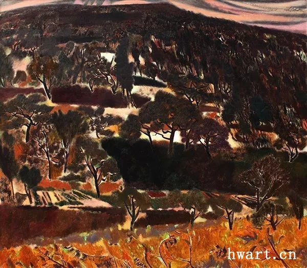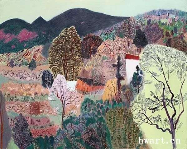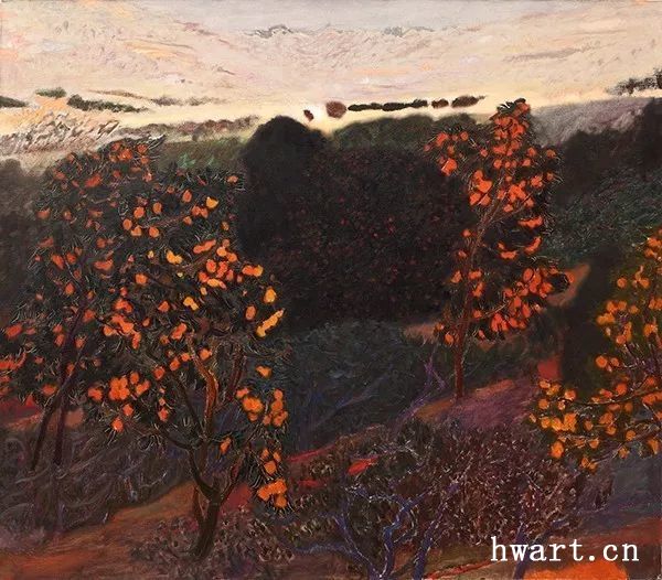 他的一幅《蘋果花叢聽蜂鳴》,采用仰視的視角,給人一種撲面而來的氣勢(shì)。枝干的蟠曲遒勁,花朵的濃淡深淺,筆觸時(shí)而密不透風(fēng),時(shí)而疏可走馬,時(shí)而描繪具象的細(xì)節(jié),時(shí)而平涂緋紅的模糊一片,表現(xiàn)著被蜂群震動(dòng)的感受。虛實(shí)的對(duì)比,遠(yuǎn)近的對(duì)比,色彩的對(duì)比,層次的對(duì)比……他用色彩吶喊出聲音,用平涂抽象表現(xiàn)出震顫,畫布上處處流動(dòng)著芳香的節(jié)奏,筆筆觸動(dòng)著春的氣息,這是春天的交響樂,春天的昂揚(yáng),春天的希望。
