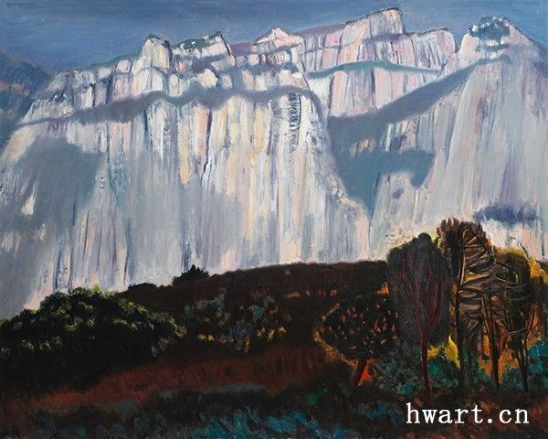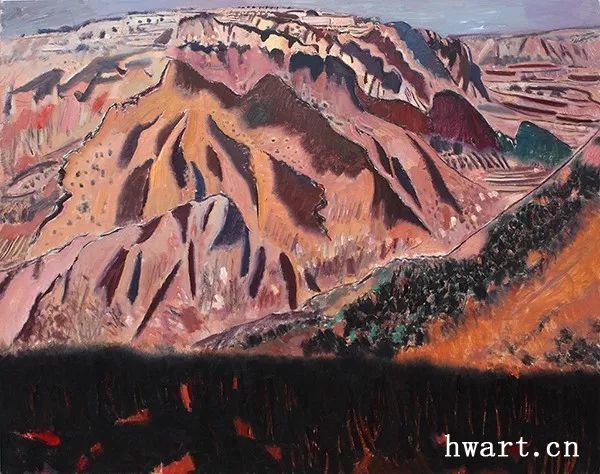 本是一座尋常的平原山脈,既不巍峨也不險(xiǎn)峻,但是在王克舉先生的眼中,這小山小水,卻有著被自然風(fēng)化侵蝕后的沉雄與擴(kuò)大。他將局部放大,細(xì)節(jié)放大,采用散點(diǎn)透視的觀察,用中國傳統(tǒng)山水的皴法結(jié)合書法的線條,用油畫的材料表現(xiàn)出來,肌理細(xì)膩到能夠感受到山的雄偉。在具有豐富變化的”筆性“的同時(shí),兼具“油畫性”。