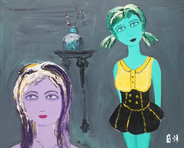 崔治中:山山的作品多以人像少女為主,以大塊矛盾的色彩構(gòu)成濃烈的視覺沖擊,其主體展現(xiàn)了女人的“少女面”、“情愫畫像”等一體多面,有著雅拙、樸素的的特征。