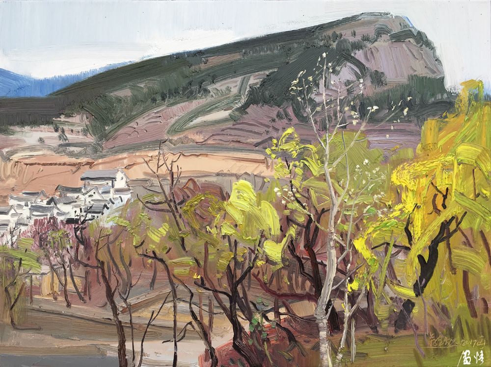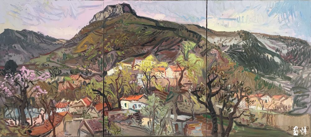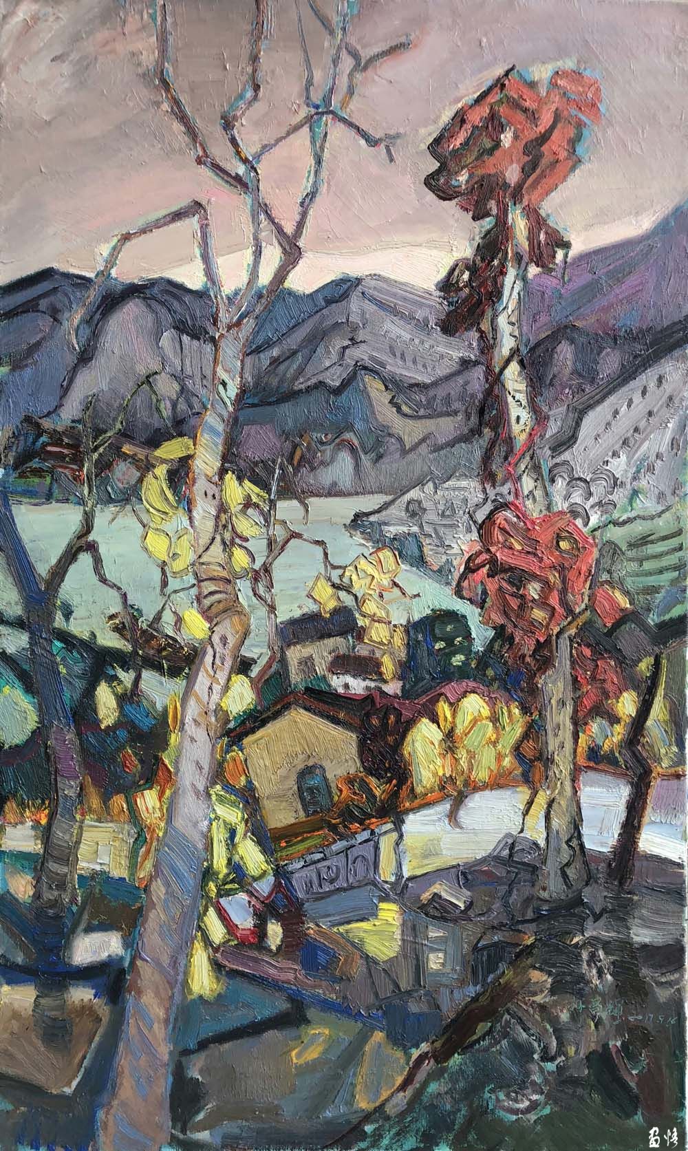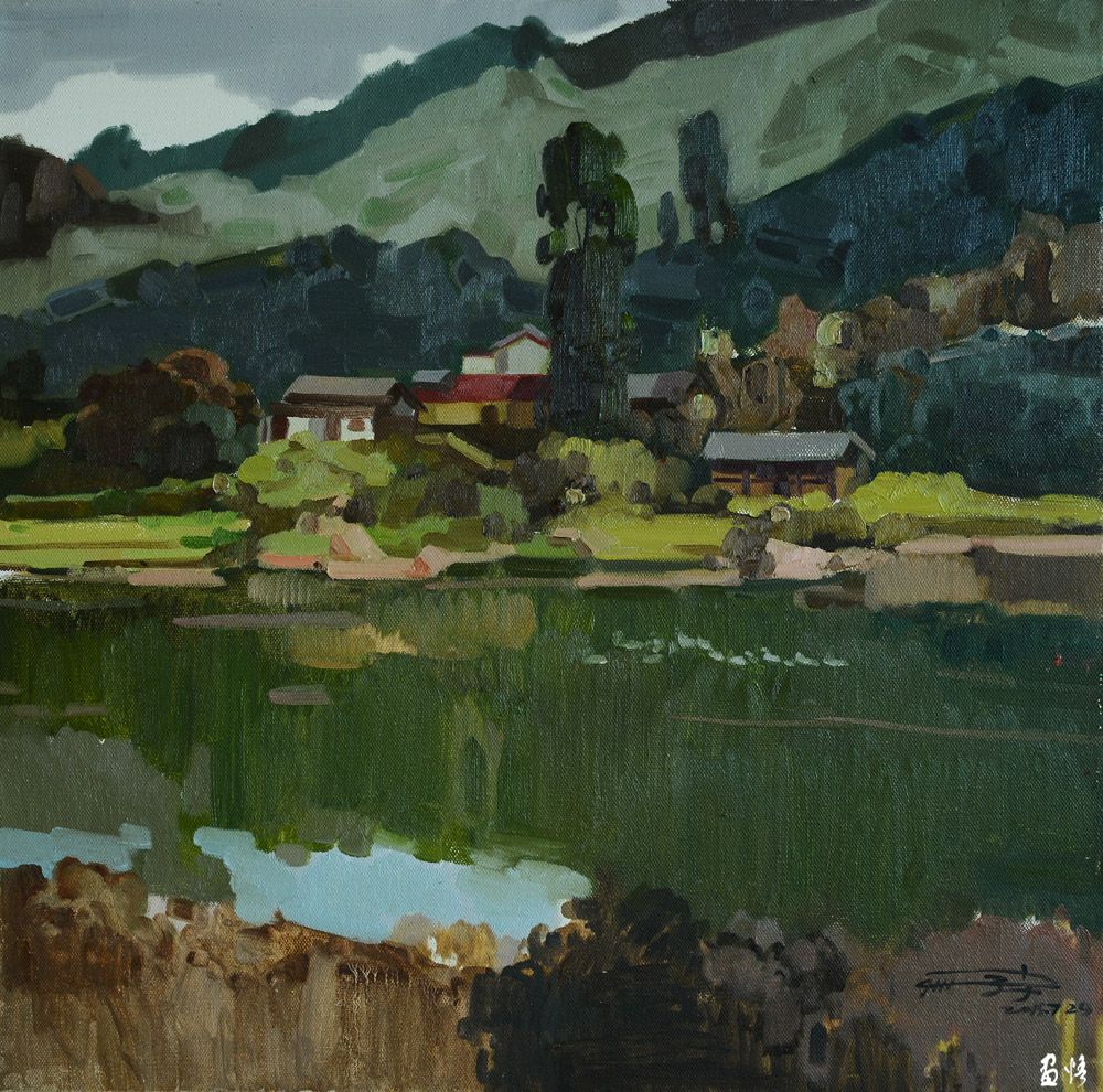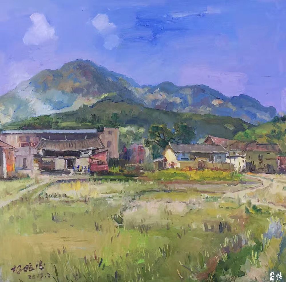 蔣建智的油畫作品主要是偏表現的鄉(xiāng)村風景,畫家沒有描繪客觀的真實,而是捕捉畫家自身的心理感受和色彩感覺,色彩斑斕,用油彩恣意抒寫著新水墨的語境,色彩斑斕。表達自己面對自然產生的心象世界。在探索油畫民族化的過程中,蔣建智合理結合中西情調,大膽的運用中國畫或傳統(tǒng)藝術的形式,使自已的作品以農村的題材形成詩一般的田園風光。作品撲面而來的是恬然嫻靜和純樸原味的鄉(xiāng)土氣息,承載著某種思念的情愫,讓人浮想聯翩。