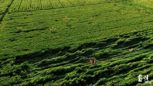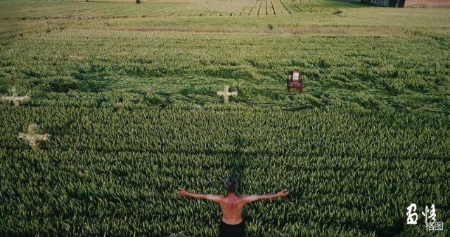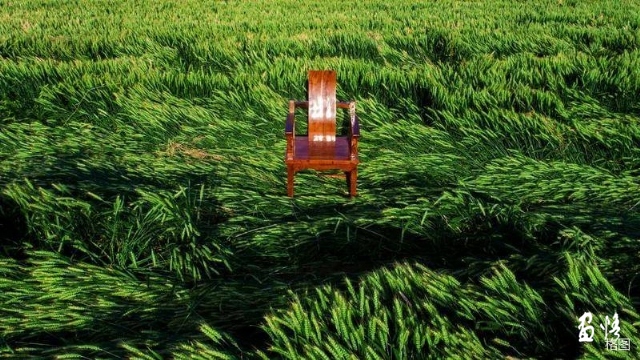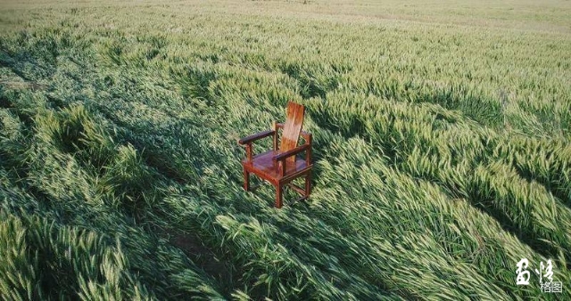 不想錯過田野的大場景,朱新戰(zhàn)在麥收之前制作了“稻草人”置放在麥田里。遠處的座椅空空,上帝缺席,審判缺席!
