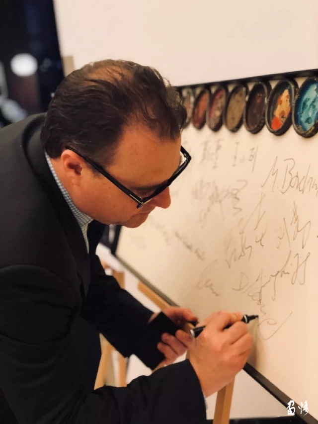 ▲畫家余德民在他的“線象”畫展上與中國駐法蘭克??傤I(lǐng)館總領(lǐng)事王順卿合影