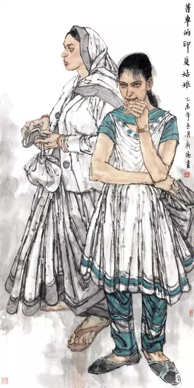 等車的印度姑娘 138x68cm 國畫