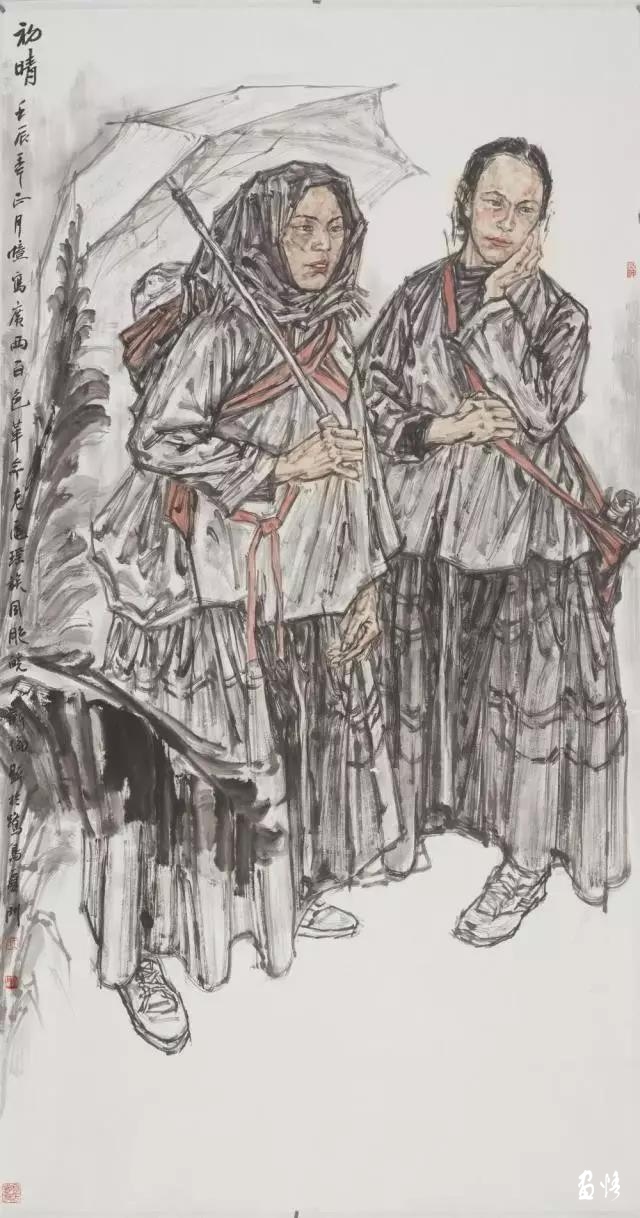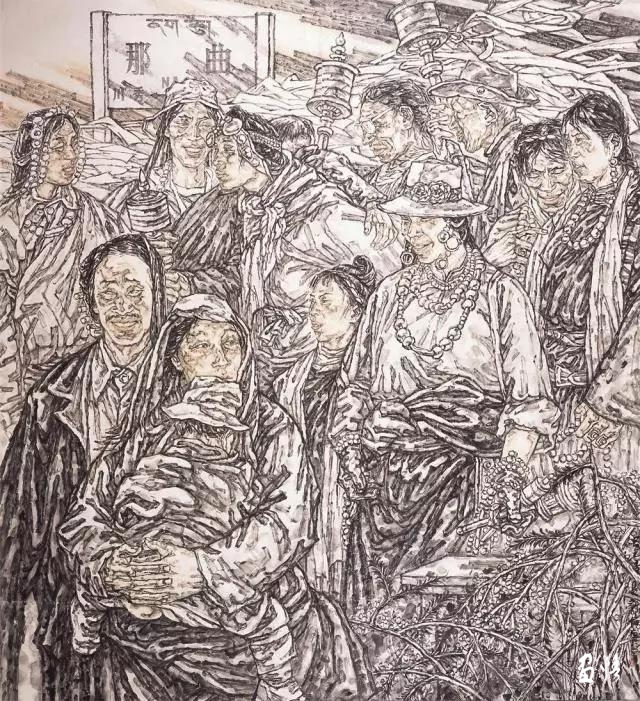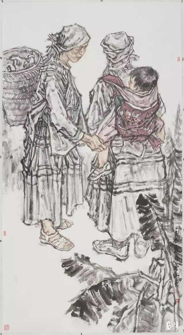 在中國藝術(shù)發(fā)展史上,中國畫在文人手里往往不過是把玩和養(yǎng)性的寄興之物。在文人的娛情遣興中,有些中國畫是文氣有余而強悍不足。王新倫沒有隨波逐流,而是力圖改變這種文氣有余而強悍不足的中國畫傳統(tǒng)。這就是王新倫在藝術(shù)創(chuàng)作中不但極力在中國當代社會的進步中捕捉中國當代社會底層民眾的微妙變化,而且努力增強畫面視覺沖擊力量。在人物選擇上,王新倫以刻畫中國當代社會底層民眾甚至少數(shù)民族群眾為主。這些社會底層蕓蕓眾生雖然肩負生活的沉重負擔,但較少保守懦弱這些痼疾,大多性格率直單純,形象強悍生動。在表現(xiàn)方法上,王新倫追求單純明朗,放棄繁復(fù)變化,以粗獷的線條增強畫面的厚重感和蒼潤效果。王新倫還大膽吸收西方油畫的一些表現(xiàn)方法,強化一些中國畫線條的表現(xiàn)力,增強造型的塑造力。這就是說,王新倫找到了一些屬于自己的表現(xiàn)手法。的確,中國畫在線條上比較圓潤飄逸,甚至有些柔靡嫵媚。在中國畫中,有些崇山峻嶺雖然巍峨挺拔,氣勢恢宏,但與人類仍然是和諧的融洽的。而在西方繪畫中,那些崇高的對象包含著恐懼的東西。這無疑能夠令人產(chǎn)生敬畏之感。而人如果沒有這種敬畏之心,就難以產(chǎn)生悲劇的憂患意識和超越意識。王新倫在吸收西方油畫的一些表現(xiàn)方法時沒有汰除那些斧鑿痕跡,而是著力刻畫了中國當代社會底層蕓蕓眾生渴望發(fā)展的強烈沖動,畫面雄渾而大氣。