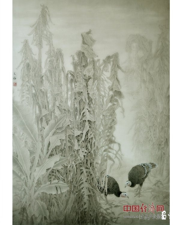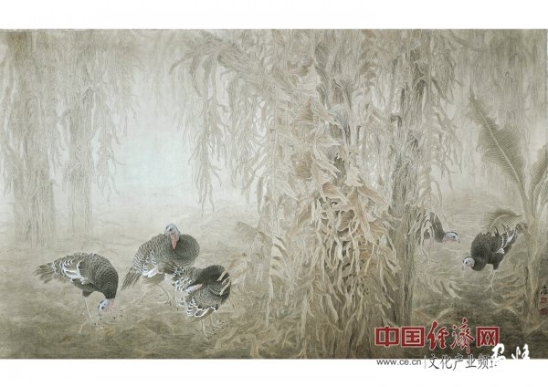 對(duì)于構(gòu)圖,文海先生煞費(fèi)苦心,就算是畫(huà)面上的一個(gè)小小角落,他也從不輕率的處理。在文海昂的畫(huà)中,時(shí)??梢钥吹竭@樣的畫(huà)面,他清晰細(xì)致的勾勒出每一處輪廓,背景是層層疊疊垂下的葉片,與泛白的一大塊的背景相互烘托,充滿(mǎn)了靜謐之感,同時(shí)也使得畫(huà)面空間感得以延伸,地面上,幾只閑適漫步的火雞將這種靜謐發(fā)揮到極致。好一派田園風(fēng)光,充滿(mǎn)著自然界和諧安逸的氛圍。畫(huà)面特有的飄逸之感不僅是精湛技藝的再現(xiàn),更源自畫(huà)家認(rèn)真的投入和對(duì)藝術(shù)執(zhí)著的追求。