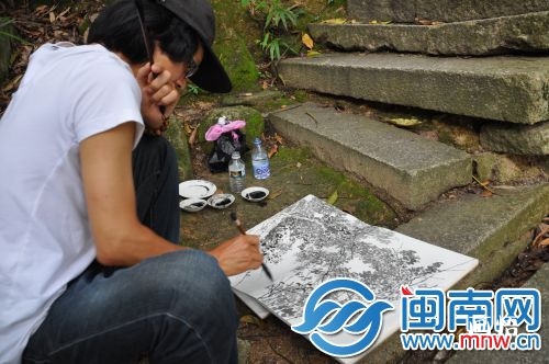 一登上天成山,畫家們便開始尋找適合寫生的地方。有的畫家席地而坐現(xiàn)場作畫,有的則通過拍照、速寫等方式記錄下所見景致。中國美協(xié)會員、福建省美術(shù)家協(xié)會副秘書長唐國新先生就用速寫的方式,在本子中繪制了許多素材畫面。