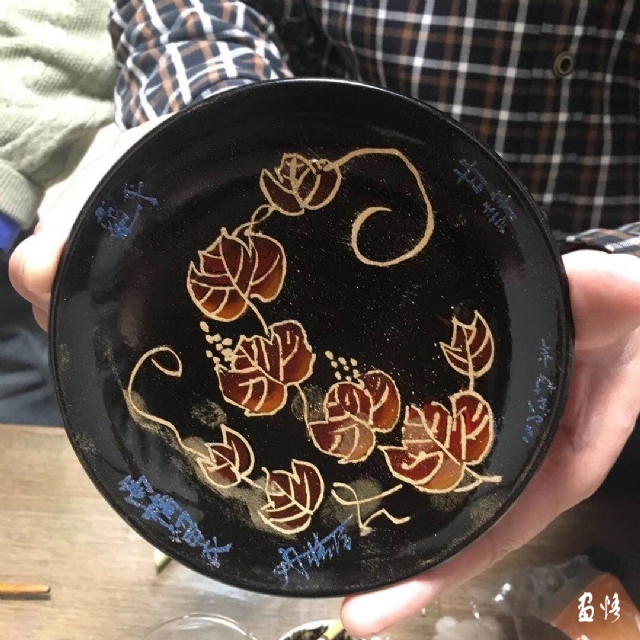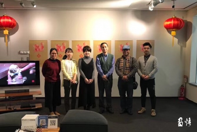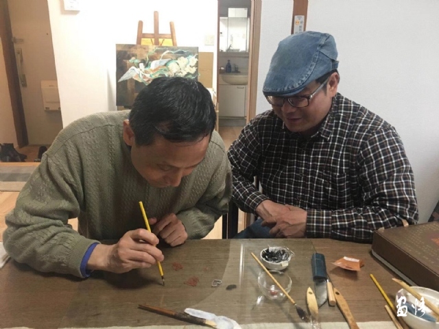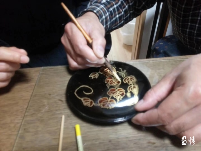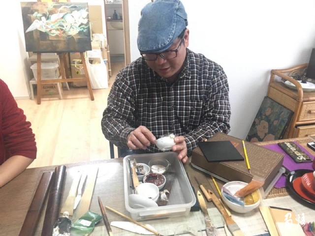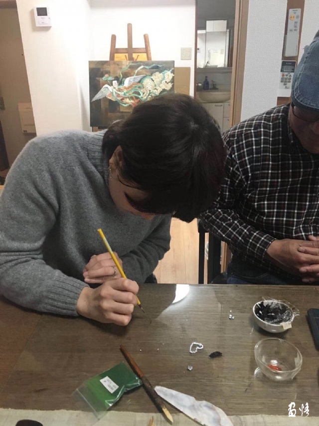 在東京教日中友好會(huì)館文化事業(yè)部趙部長(zhǎng)、高橋留一、甘靜女士等體驗(yàn)蒔繪春花漆盤。同時(shí)為明年展覽事項(xiàng)加油。