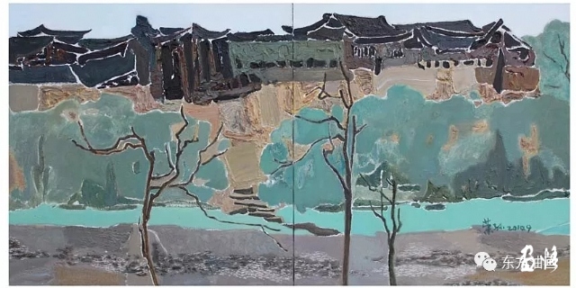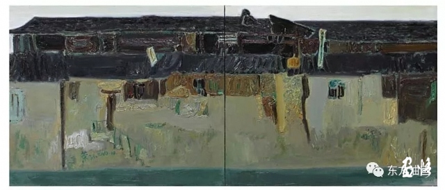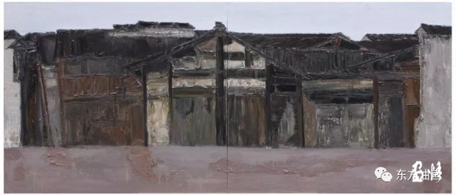 在那組《老房》系列里,楊榮孫采用的大多為橫式的寬銀幕構圖形式,運用厚重而單純的深色來描繪這些飽含歷史滄桑和人文內(nèi)涵的中國老民居,確切一點講就是福建閩北的老民居。他沒有運用細碎的筆觸,而是改用寬大粗放的用筆;沒有拘泥于細節(jié)的深入刻畫,而是將對象的特點和自己內(nèi)心的感受,運用中國傳統(tǒng)繪畫中的寫意手法進行重塑和表現(xiàn)。他的這種重塑和表現(xiàn)不僅不受對象的真實形象所局限,而是采用了一種寫實與寫意相結合的方法,即中國繪畫的寫意手法。