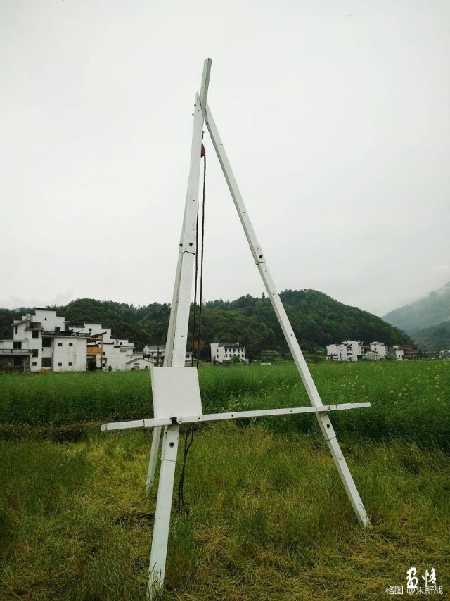 江西婺源虹關外言坑,朱新戰(zhàn)和一個寫生團隊來到這里。假以寫生之名實施他的概念作品“架畫”,高達6米的巨型畫架上繪制小尺寸油畫,畫什么不重要了,架上繪畫對話大裝置并發(fā)生關系時,這種看似不得不發(fā)生的關系給人視覺、心理的沖擊是難以回避的!這個巨型畫架從河南??h的“架上”挪移到江西婺源“架畫”,架上的行為與架上的真實繪畫把“架上”這個概念引向了深入。