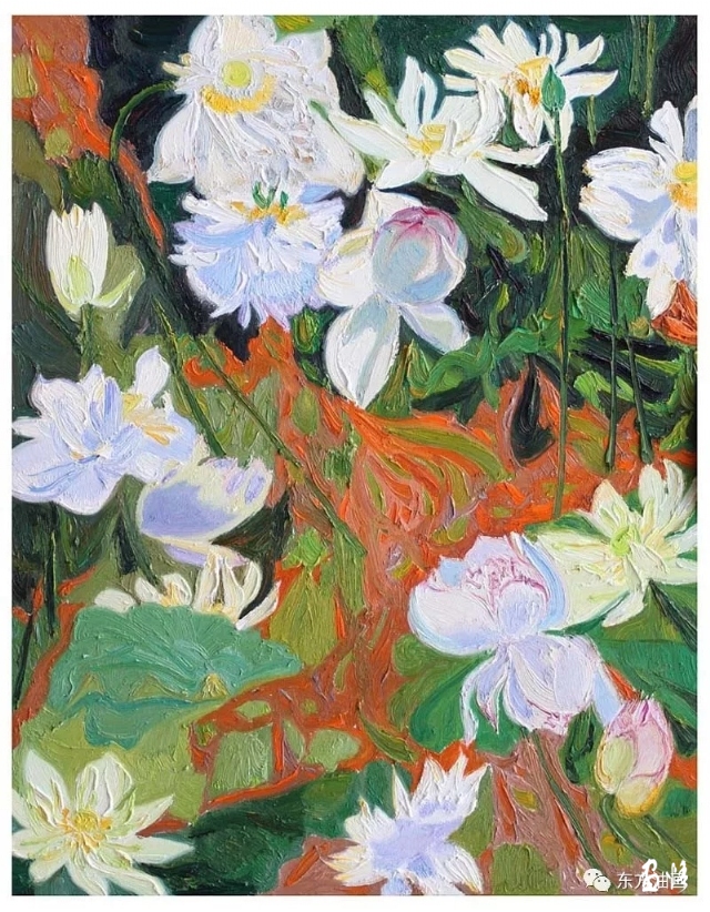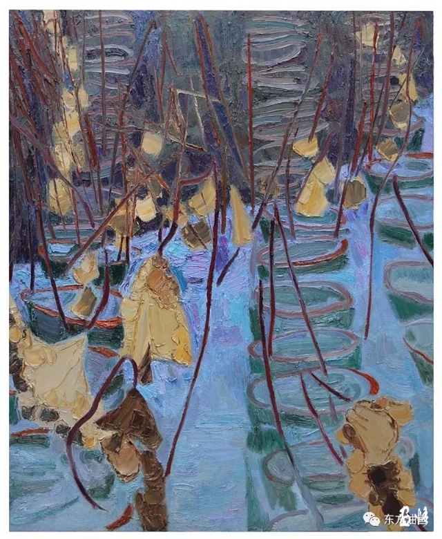 在肌理的處理上,用筆的方向、快慢,顏料的厚薄、干濕,粗糙與光潔等,都根據(jù)自然物象本身的特征將視覺感受和心理感受結(jié)合畫面的具體需要來處理。強(qiáng)調(diào)體現(xiàn)油畫材料的特質(zhì)所產(chǎn)生的特有的肌理效果,同時注重畫筆、刮刀等工具在塑造肌理上的作用。