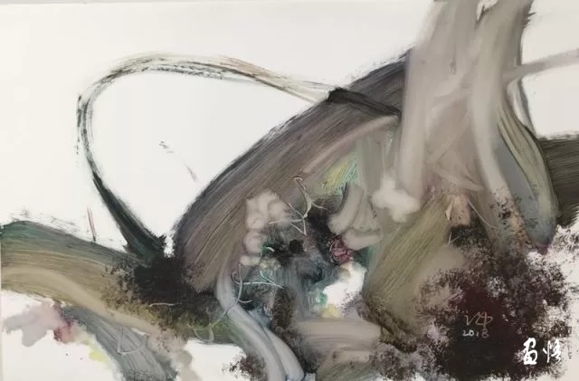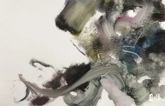 初見(jiàn)這些作品,筆觸扭轉(zhuǎn)翻騰,纏繞糾結(jié),但又如同天地之間流轉(zhuǎn)的“氣”,無(wú)形的交織穿插,絲毫不覺(jué)一點(diǎn)的阻塞之感,心里不禁想起莊子《逍遙游》中那句“野馬也,塵埃也生物之息相吹也”。凝視之下,甚至?xí)谶@些抽象筆觸的運(yùn)動(dòng)中隱約感受到那“玄之又玄”的“道”的存在。