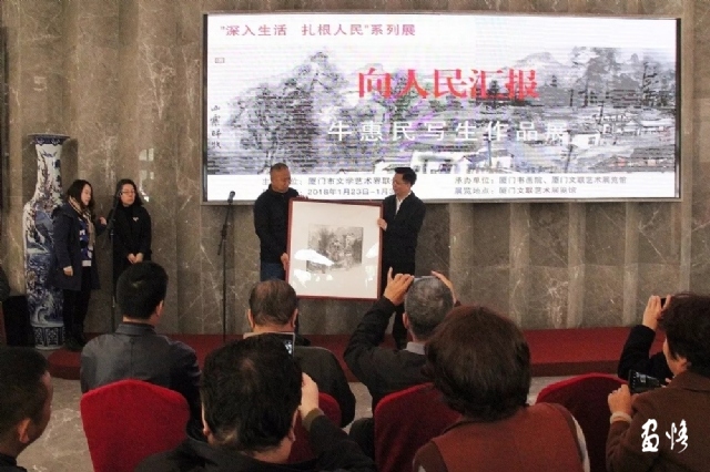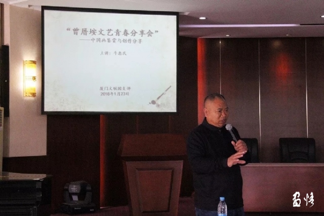 開幕式前,由廈門市文聯(lián)團支部組織的“曾厝垵文藝青春分享會”在廈門市文聯(lián)多功能廳舉辦,廈門書畫院牛惠民老師為眾多文藝青年講述中國畫發(fā)展史以及如何學習中國畫,參加分享會的有廈門市文聯(lián)、濱海街道、思明檢察院的青年干部及廈門藝術(shù)學校的學生。?;菝窭蠋煆闹袊嬭b賞談到寫生創(chuàng)作,分享自己的創(chuàng)作故事。