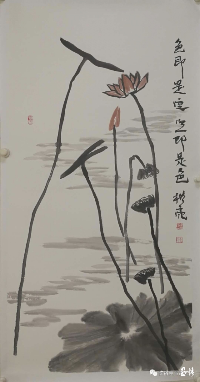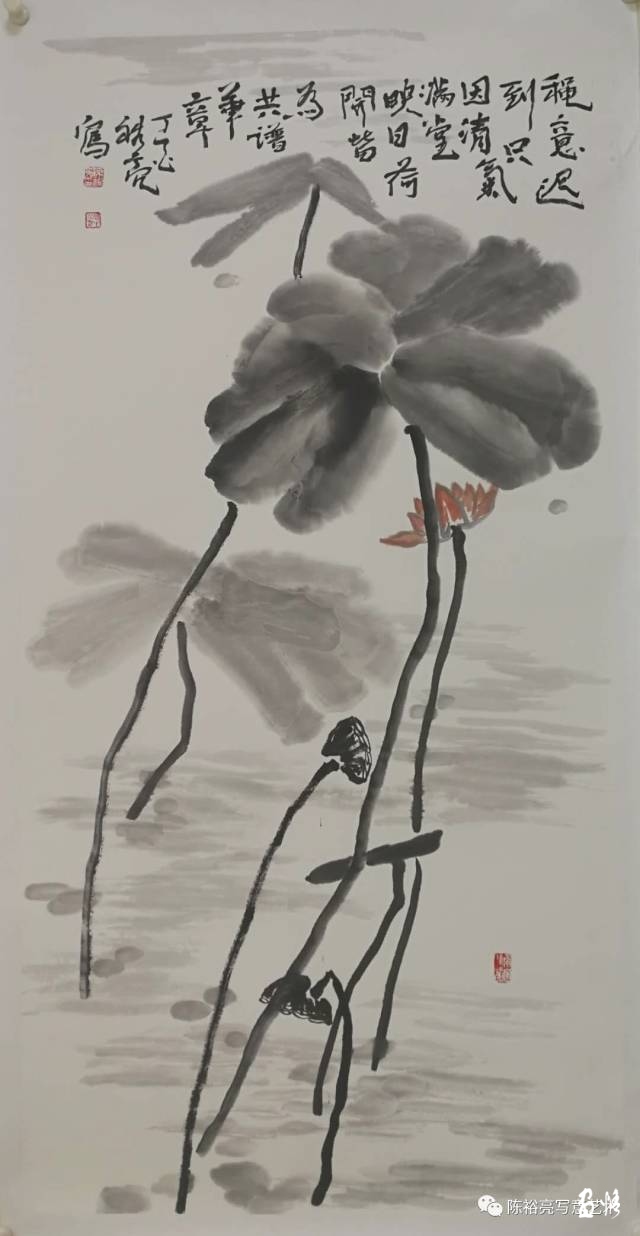 縱觀陳裕亮的藝術(shù)經(jīng)歷與創(chuàng)作,就會(huì)發(fā)現(xiàn)他注重文化學(xué)養(yǎng)的積累,對(duì)傳統(tǒng)經(jīng)典深入研讀,汲取滋養(yǎng)了文化胸襟,從而形成了他人生藝術(shù)坐標(biāo),扎根民族文化基礎(chǔ),把握新時(shí)代的脈搏,在浮躁喧囂中保持一份睿智冷靜,是一位有志于復(fù)興中華名族文化的人所具有的的擔(dān)當(dāng)。他的荷畫給人的第一印象是舒朗而大氣,干凈又空靈,他繼承了歷代文人畫求詩味講意境的傳統(tǒng),用技上卻又不乏獨(dú)有的筆墨追求。他用筆堅(jiān)毅而不雜亂,且厚重古樸,使所畫荷氣盎然意深而境遠(yuǎn),由古取類而化出,不乏古韻卻有時(shí)代新風(fēng),他強(qiáng)調(diào)的通靈詩情畫意。在我看來,衡量一個(gè)人的文化藝術(shù)成就,不僅要看他自身的修養(yǎng)成就,更要看他如何為社會(huì)為民眾提供有價(jià)值的思想和精神產(chǎn)品。裕亮的荷花枝干剛勁有力,厚實(shí)挺拔,形式感突出而鮮明,與很多畫家筆下的荷花相比,裕亮筆下的荷花更有堅(jiān)強(qiáng)旺盛的生命力,在枝葉簇?fù)碇酗@荷花亮麗風(fēng)骨。