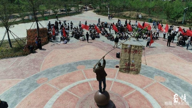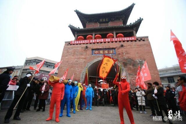 數(shù)十萬的圍觀群眾在西街村社火隊六十多人里試圖找到金箍棒的主人,只見藝術(shù)家高舉“齊天大圣”的旗幡迎風招展。