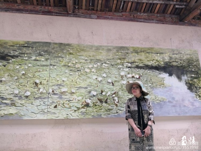 極具特色的畫室、展廳與長(zhǎng)廊,仿佛把一切都準(zhǔn)備好了,迎接著我們這些遠(yuǎn)道而來(lái),為了心中那份執(zhí)念而鐘愛藝術(shù)的朋友。展廳的作品,與這山這水交相輝映。一幅幅深沉含蓄,充滿真情的作品,讓我的思緒隨著畫面的音律、節(jié)奏、延伸跳躍。一幅6米x1,8米的睡蓮,抓住了我的視線。如此大的畫面,整體把控如此之好令人敬佩。畫面結(jié)構(gòu)嚴(yán)謹(jǐn),疏密有序,用筆繁而不亂。杜老師仿佛是一位歌者,一個(gè)個(gè)小小的筆觸好似一串串小小的音符,以其特有的表現(xiàn)形式,呈現(xiàn)著它的美感。這些元素柔美地繾綣在一起,有節(jié)律地彈撥著一首動(dòng)人心弦的《睡蓮曲》。