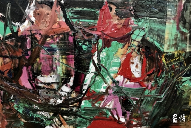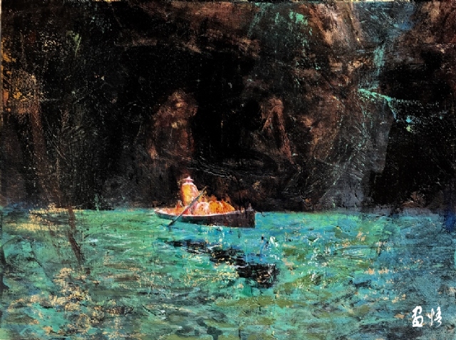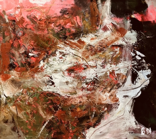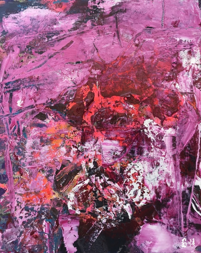看明華的畫,首先映入視野的,是經(jīng)由自然物像借勢而來的抽象的框架結(jié)構(gòu)。將繁雜繽紛的自然景象進(jìn)行整合提煉和強化。濃郁、厚重、強烈的色彩和畫面效果。顯示出他對畫面的把控能力和繪畫上的主動性。而他的作品不論大畫小畫都有一種大氣磅礴的氣勢,和格調(diào)不俗的品質(zhì)。這種氣勢首先來自他筆意的書寫性與意象境界的表達(dá);格調(diào)則來自對繪畫本身問題的探索,而非拘泥于對自然的描摹再現(xiàn)。他的《船》系列間于具象與意象的表現(xiàn),很震撼,看后有一種揮之不去的神秘甚至恐懼的感覺!而植物系列則燦爛茁壯,生機盎然,又是一番天地。