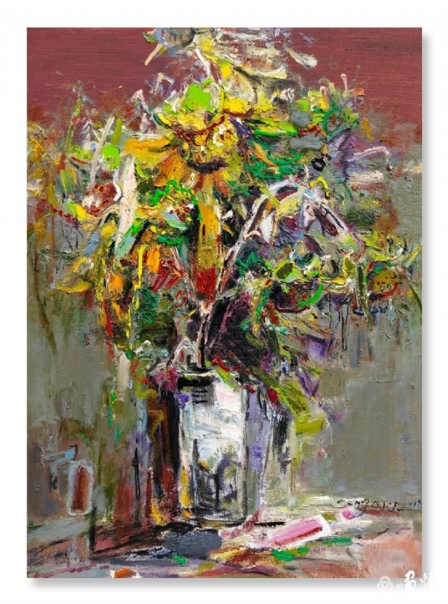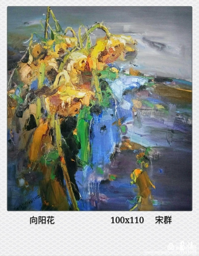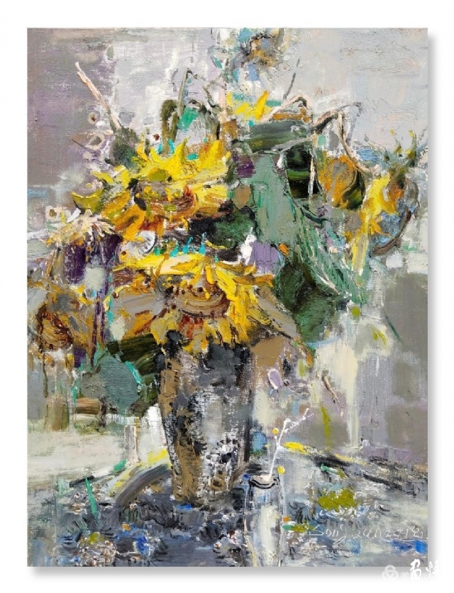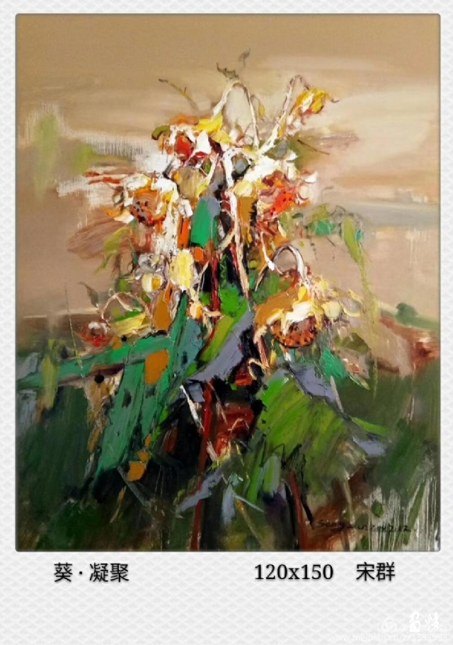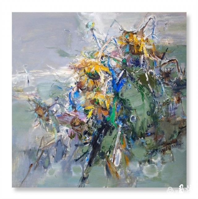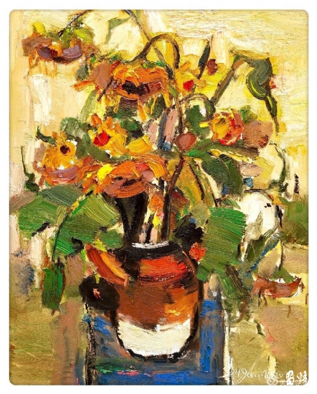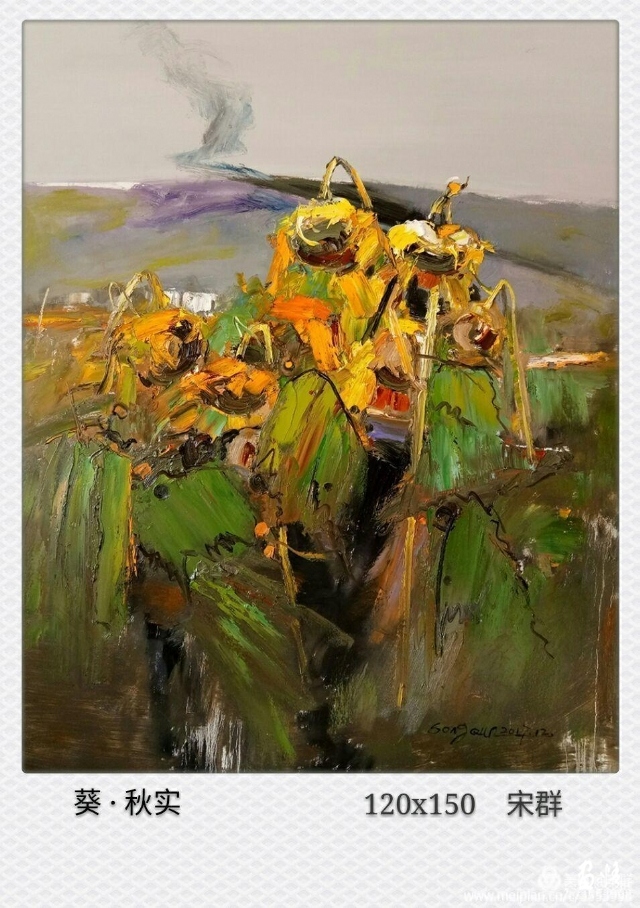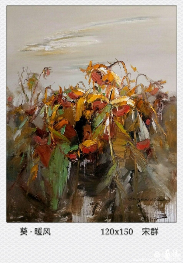 流動(dòng)的黃被深沉的綠擁著,濃郁而熱烈。那些隨風(fēng)翻滾著的深褐色的葵頭,使得這片葵園更富有色彩感。它們很美,美的生動(dòng)而燦爛。支好畫箱,擠好顏色,雪白的畫布上便涌出了流暢的線條,手中的扇形筆和著音樂隨心寫意,似要揪出內(nèi)心的感動(dòng),在畫布上構(gòu)建著葵的世界。心情也被感動(dòng)著,變得深情而朗潤起來。