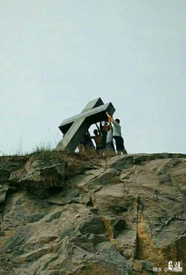 早在云南青少年時(shí)期,常常被告知不可接近天主教,也知道發(fā)生苦寒山區(qū)傳教的“犯罪行為”,神父被繩之以法。那是圍火吃幾個(gè)燒土豆的窮鄉(xiāng)僻壤??!最近就是去年大規(guī)模的拆毀基督教堂的事件,有牧師襲案被捕。也就因?yàn)檫@個(gè),藝術(shù)家憤怒了:河南籍藝術(shù)家朱新戰(zhàn)挺身而出,要把鋼鐵十字架樹(shù)在巖壁之上!