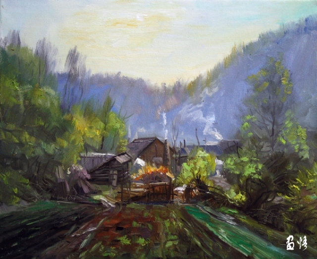 《山里農(nóng)家》布面油畫.作者;石廣武.尺寸;80X60(CM)