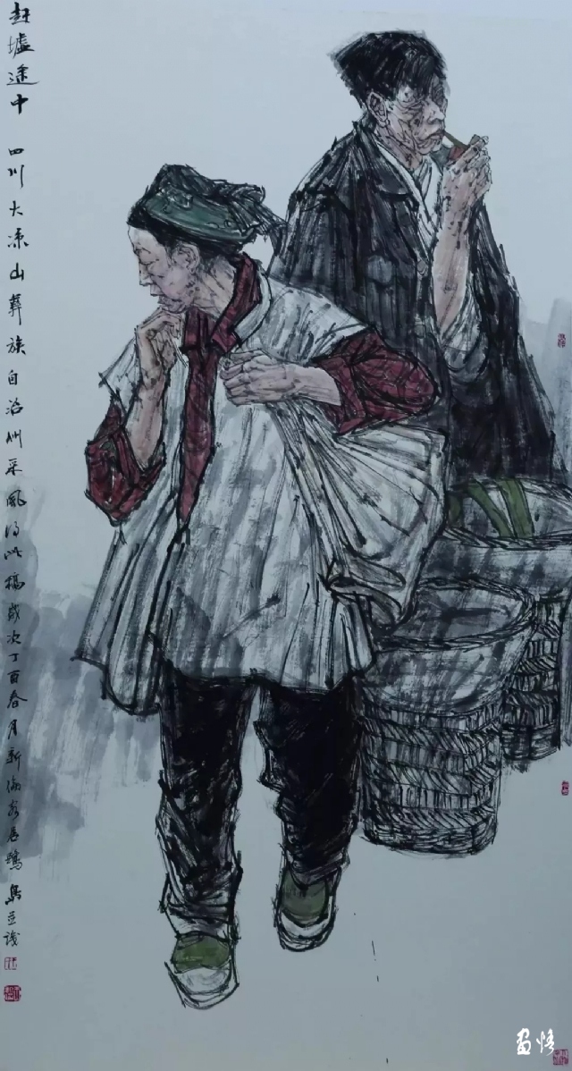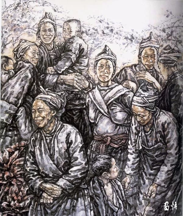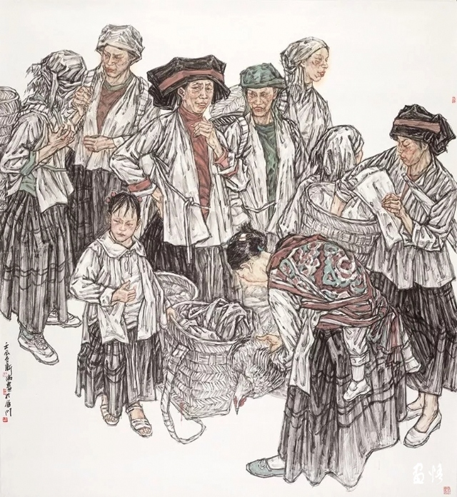在諸多題材中,王新倫尤其擅長畫人物畫,而且是平民題材作品,目的是著力展現(xiàn)出勞動(dòng)者創(chuàng)造歷史的原始渾樸的力量。為此,他四處采風(fēng),用畫筆描繪了大西南高原上的瑤族兄弟姐妹、淮北平原上辛勤勞作的農(nóng)民,以及載客少歇的都市的姐,還有面對改革浪潮沖擊的鋼鐵工人、煤礦工人。而在筆墨運(yùn)用上,他又盡量做到硬實(shí)而不板結(jié),波斫轉(zhuǎn)曲而不瑣碎,富有整體感,“讓整個(gè)人物群像統(tǒng)一在一片蒼茫豐厚而又燦然的筆墨調(diào)子中”。