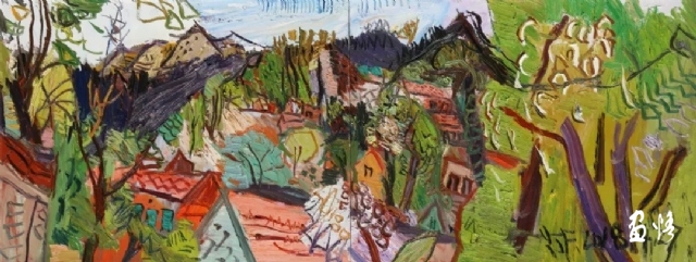 二是在克舉先生的指導(dǎo)下,他掌握了油畫寫生的要領(lǐng),注重把握重點,概括自然物象的形貌,形成富有節(jié)奏的畫面布局。他尤其抓住色彩表現(xiàn)力這個語言,在感受自然色彩的基礎(chǔ)上提高色彩的純度、明度和強度,將自然風(fēng)景的色彩關(guān)系轉(zhuǎn)換為畫面色彩的結(jié)構(gòu),以此為主導(dǎo)統(tǒng)攝畫面,形成以色彩為關(guān)鍵詞的敘事。在色彩的感性方面,他顯露出優(yōu)秀的秉賦。