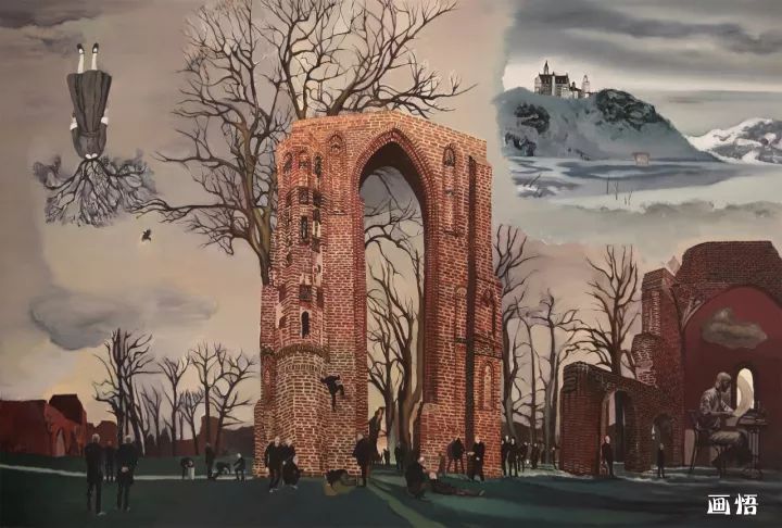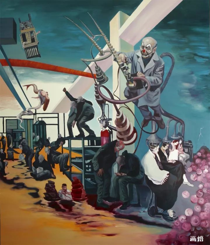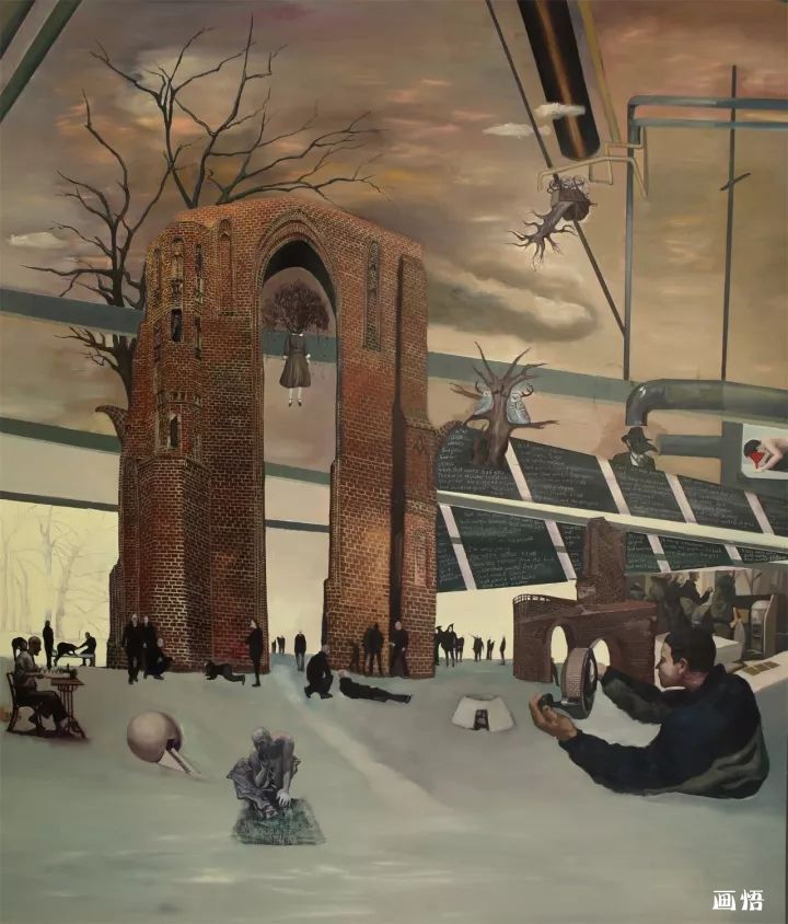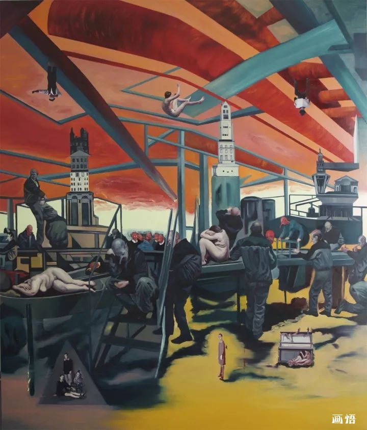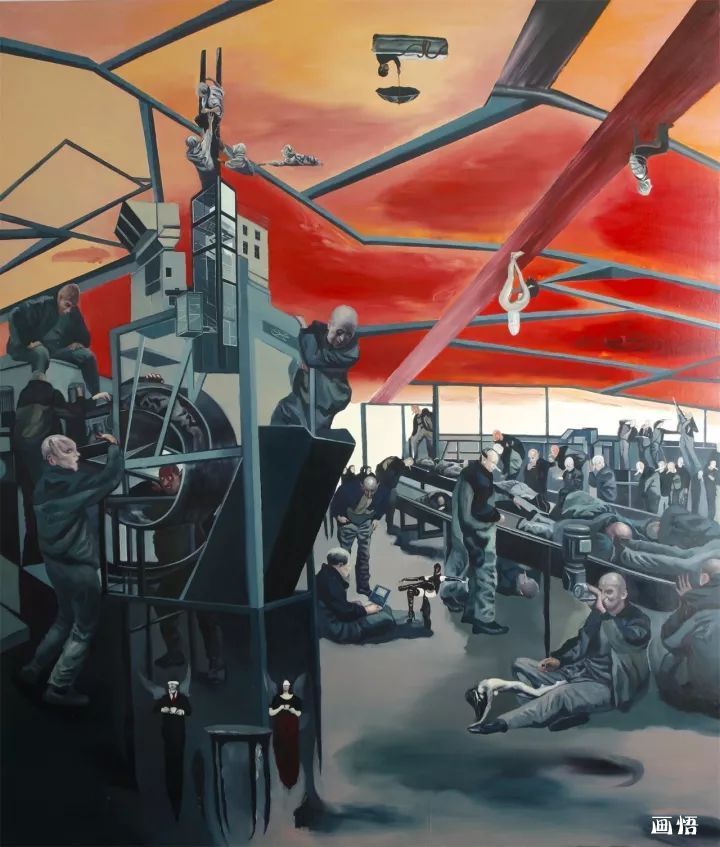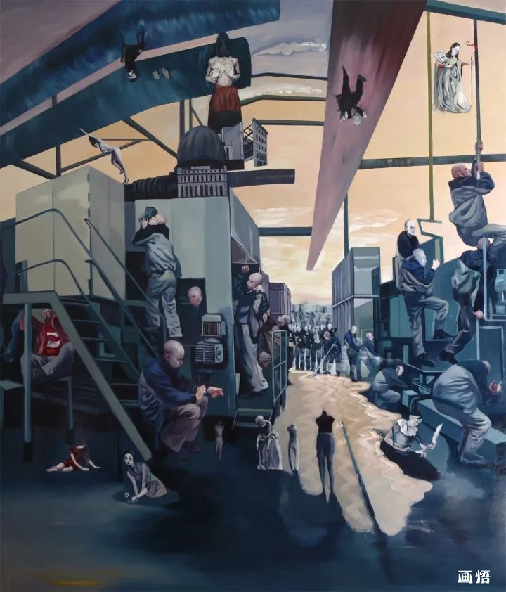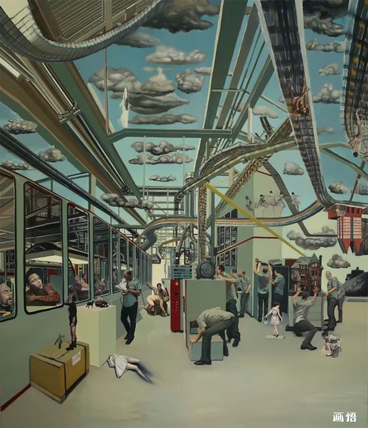 我日常生活里我們不知不覺與不同的建筑場景發(fā)生著各類戲劇性事件,每天面對它們,在建筑物里渡過我們的每一天,這不正表明:日常建筑物在對每一個人產(chǎn)生作用嗎?觀念和行為可以改變歷史,但是,建筑物和在室內(nèi)的電器產(chǎn)品也同樣可以改變歷史。正如人和觀念都有自己的命運一樣,建筑物也有自身的特定命運,畫面里出現(xiàn)機器大生產(chǎn)中,這些以電為基礎(chǔ)的物體,它們也在快速脫離人的意志而自主地進化,它們也有自己奇妙的生命歷程。所以我運用工業(yè)化的生產(chǎn)流水線穿插和支撐整個畫面,使各種“勢”在整體畫面里盤旋和回蕩,各種荒誕的建筑充滿儀式感地盛裝登場,既熟悉而又陌生、既日常而又怪誕,它們超越了特定的意識形態(tài)而在世界各個角落生根發(fā)芽。因此,我試圖通過描繪“世界能量工廠”來記錄這個時代,記錄這個“能量工廠”里可能發(fā)生的一切。