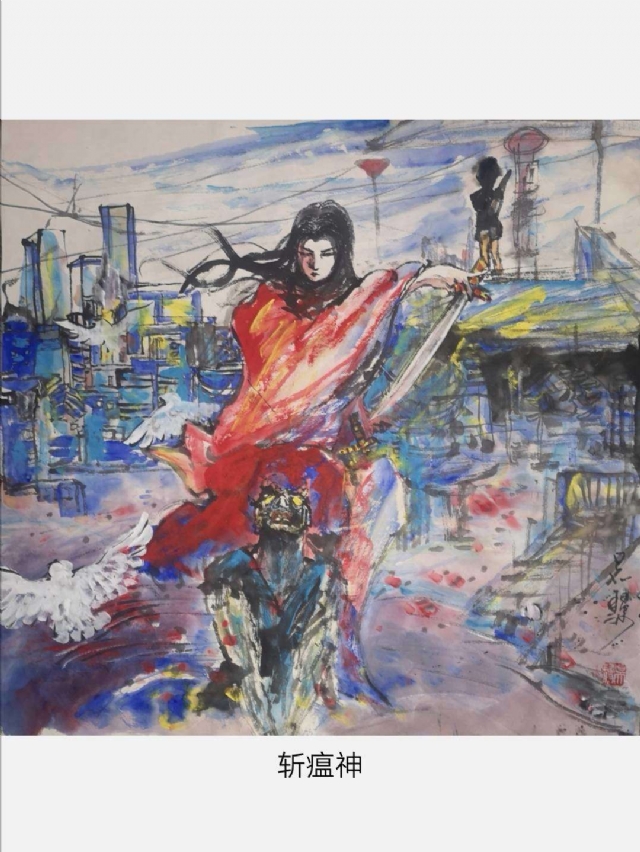 這幅的意思是:著中國紅的“武士”,佑護中華,跳上瘟神背部,輕輕一刀斬死瘟神,彼時,鮮血東流去,白衣天使化作和平鴿,飛過重建家園的武漢上空,小孩站在高處,眺望著遠方,祥云在電線桿上穿梭,一場災難必將結(jié)束