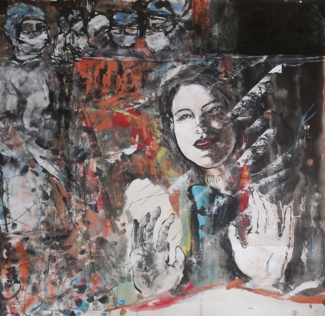 這幅意思是:室外卻是大風大雪中醫(yī)務人員英勇赴漢,舍身取義,我們望向窗外心系武漢,眼中露出祈盼平安的神情,祈盼英雄平安,更等待春天的來臨