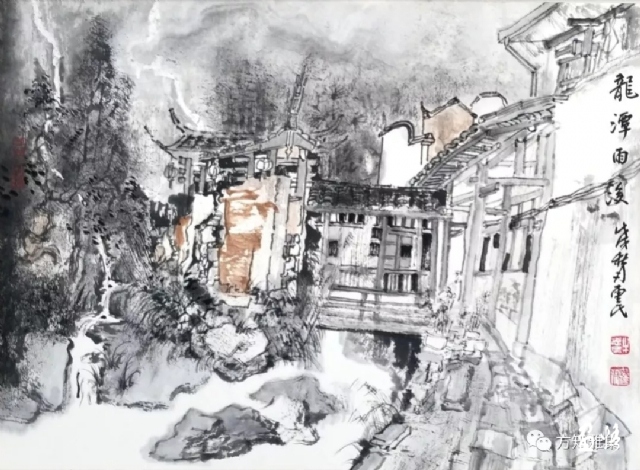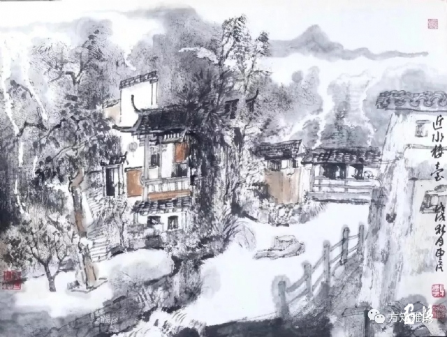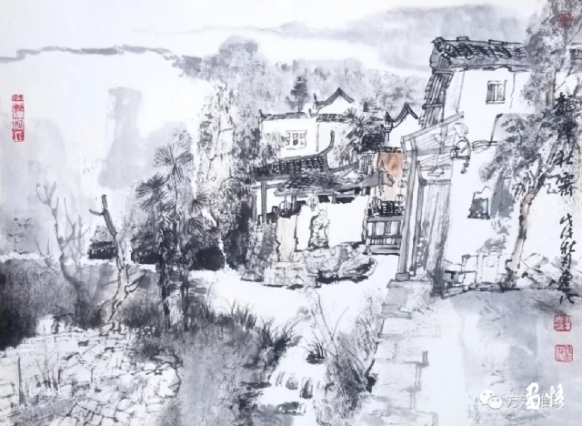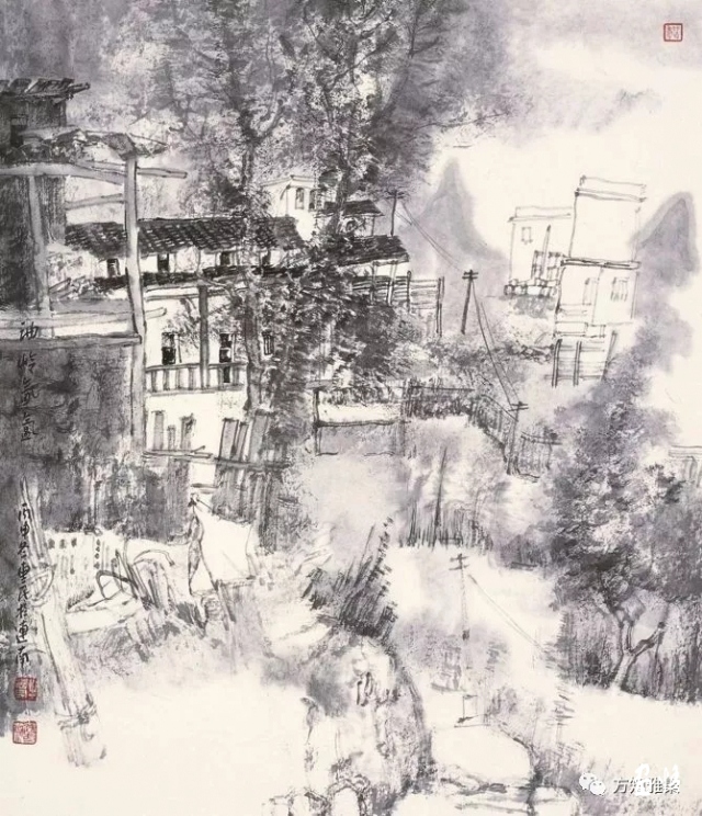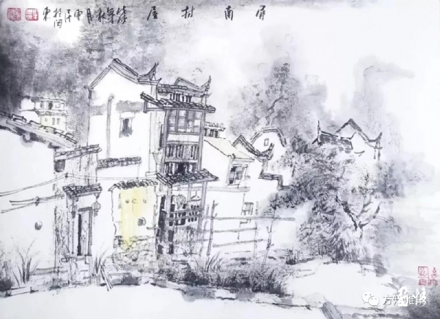 ?;菝瘢簩?duì),剛?cè)幍缕聊蠈懮貋?。我們中國的古民居呢,?shí)際上還是較豐富的。可現(xiàn)在的古民居破壞的比較厲害了,這個(gè)有點(diǎn)可惜。許多中國畫家都喜歡畫傳統(tǒng)民居,因?yàn)樗貏e容易觸動(dòng)畫家的想像和情感。就比如我們福建地區(qū)來說,閩西的土樓、閩北的這種帶有微派建筑的民居、閩南的這種紅磚燕尾厝。都是不一樣的,這個(gè)畫面呢,怎么能夠用最簡潔的語言表達(dá),你對(duì)客觀生活的獨(dú)到感受。這一點(diǎn)很重要,一定要獨(dú)到。你畫的東西跟別人一樣,照著別人的那個(gè)筆墨去畫,那你畫出來的都是別人的東西。所以貴在表現(xiàn)自己獨(dú)到的感受,獨(dú)特的語言,形成自己獨(dú)特的風(fēng)格。你看我最近的畫,在表現(xiàn)古民居時(shí),不只是畫其形,而是去追其意,追自己的內(nèi)心。是在一個(gè)簡單的形里面追求一種大道至簡的語言,追求單純、追求簡潔、追求柮。