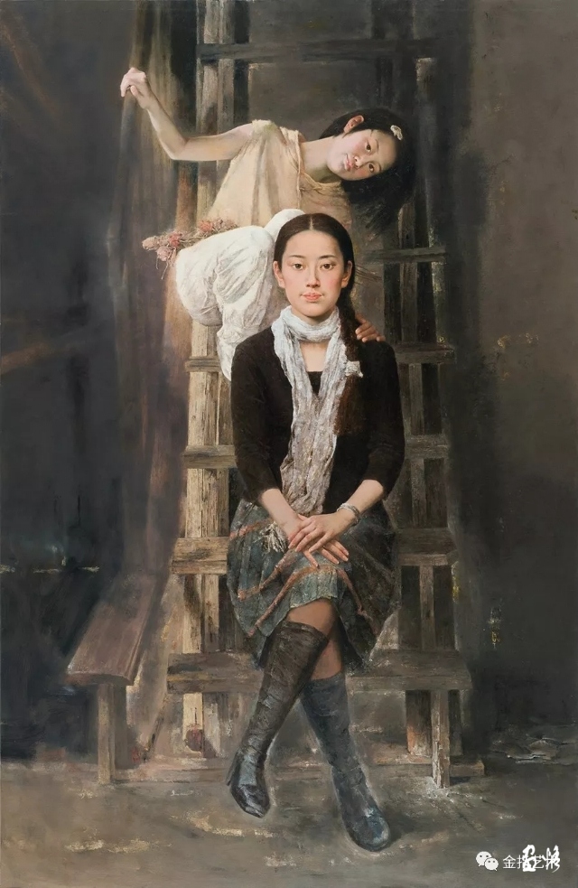 “繪畫對我而言是內(nèi)心世界的宣泄,自我的獨白。我希望用具象表現(xiàn)的方式、沉靜含蓄且強烈刺激的形式、灰色的調(diào)子將自我的感受、情感、情緒傳遞。女性如同花,將花作為女性情感的載體,花也有了歡快,苦悶、美妙、低落、興奮,冷靜的情感情緒。”這是畫家劉藝孛對自己繪畫的闡釋。作為90后畫家,劉藝孛常用一種自傳式的圖式,述說90后們成長的故事,傳遞對時代生活的感悟,作品風(fēng)格洋溢著清新的氣息,如同盛開的玫瑰花,璀璨奪目,芬香撲鼻。如《花語系列》中,文靜清純的少女在虛無空曠迷離的不確定的畫面環(huán)境表象下流露出天真俏皮又靜謐的神情,這神情潛藏著青春期少女對未來人生迷茫、期許、向往的人生態(tài)度。《角色》系列作品回歸寫實油畫,現(xiàn)實的人物與舞臺戲劇人物的組合,實現(xiàn)著角色的互換,戲劇角色映襯生活角色,一面歷史,一面生活,作品風(fēng)格在清新中顯穩(wěn)重。劉藝孛的系列作品在審美和價值觀方面打上自己的生活閱歷與時代的烙印,追求新潮,弘揚個性,有著強烈的個人色彩。