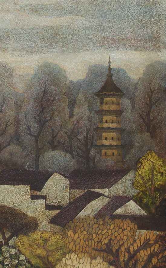 畫家注重自然景觀與漆藝術(shù)的結(jié)合,在作品中通過景物中的樹和建筑以及祥云之間前后遮掩的啟承轉(zhuǎn)合,形成了錯(cuò)落有序的遠(yuǎn)近空間感,構(gòu)成景物間微妙而和諧的關(guān)系,以及豐富變化的自然形態(tài)。