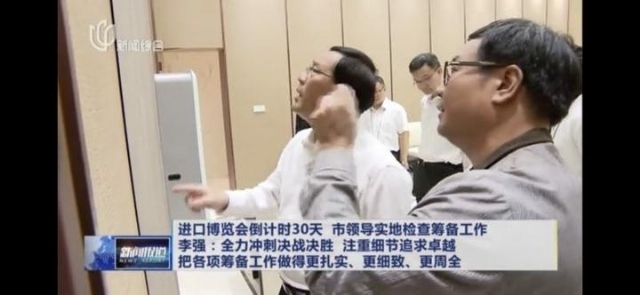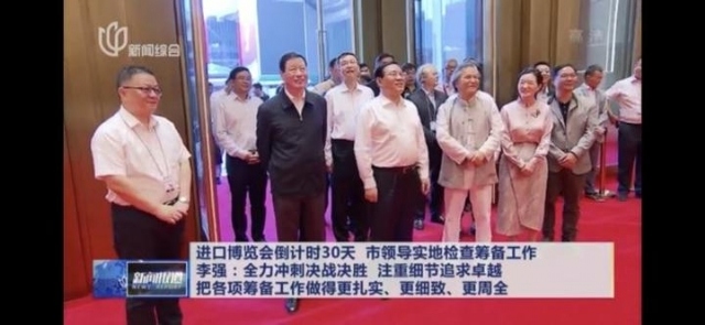 圖為進(jìn)博會開幕式前,周榕清(圖右)向檢查工作的中共中央政治局委員、上海市委書記李強(qiáng)(圖左)一行介紹漆畫《春和景明》的構(gòu)圖立意和創(chuàng)作情況。