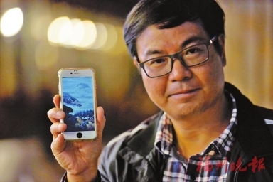漆畫大師周榕清向記者展示《春和景明》照片。