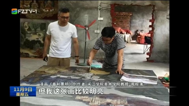 漆畫《春和景明》創(chuàng)作者閩江學(xué)院美術(shù)學(xué)院教授周榕清:在傳統(tǒng)的漆畫中,它在色調(diào)上會稍微偏暗,比較深沉。但我這張畫比較明亮,而且整個畫風(fēng)比較輕松。每一次易稿,對漆畫來說,反反復(fù)復(fù)做的工程量是非常巨大的。雖然是辛苦,但現(xiàn)在應(yīng)該是非常愉悅。我們內(nèi)心也充滿了自豪。