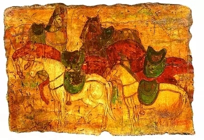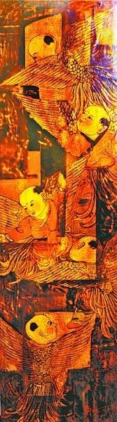 我的漆畫創(chuàng)作約經(jīng)歷了三個(gè)階段。第一個(gè)階段,重在表現(xiàn)對(duì)故鄉(xiāng)土樓的鄉(xiāng)愁和依戀。第二個(gè)階段以土樓作為繪畫語(yǔ)言的一種符號(hào),結(jié)合傳統(tǒng)山水畫的特點(diǎn),將土樓與傳統(tǒng)山水熔為一爐,表達(dá)對(duì)天地人和的一種思考。第一、二階段,題材上彼此關(guān)聯(lián),或許可歸為鄉(xiāng)土摹寫與山水思索,即鄉(xiāng)愁一類的作品。第三個(gè)階段,則是從2009年至今,由于對(duì)外藝術(shù)交流漸趨頻繁,反過來激發(fā)了我對(duì)歷史文化的多角度、多側(cè)面的珍視,我開始從中國(guó)古代傳統(tǒng)壁畫中汲取營(yíng)養(yǎng),尋找新的漆畫藝術(shù)載體。
