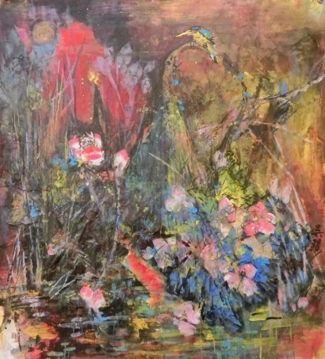 我的繪畫是不受約束,自己作畫、隨意作畫。有些時(shí)候,先是亂畫,過程中會(huì)有意無意的形成一些偶然形、有機(jī)形,然后我會(huì)迅速抓住,使其成為一種主題思想。但這不是絕對,主題是一直在變的,變到最后也許面目全非,那才是真正情感的宣泄。再進(jìn)行有知的玩性和無知的滲入,盡力把傳統(tǒng)國畫的筆墨與西方藝術(shù)相結(jié)合,保持畫面的豐富性、偶然性、神秘性。讓七色翩翩起舞。更具視覺張力,給人以更美的享受。