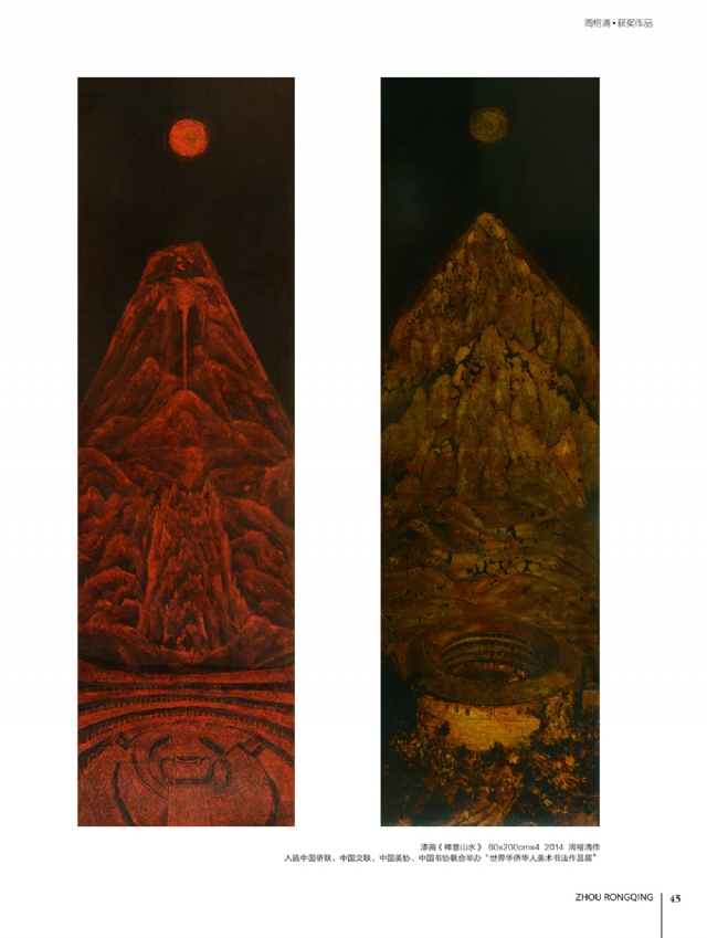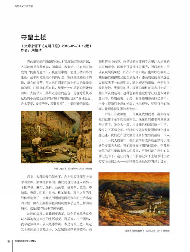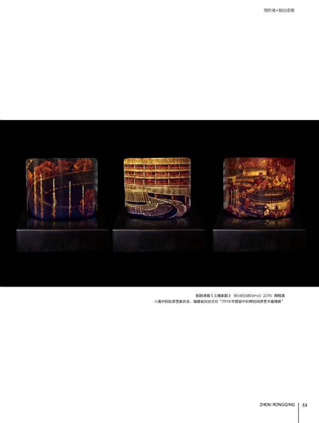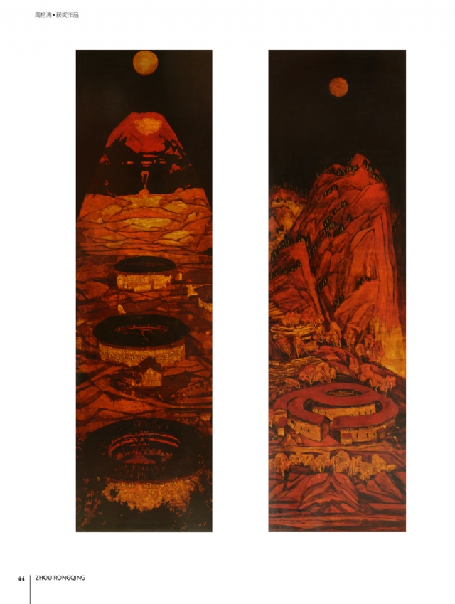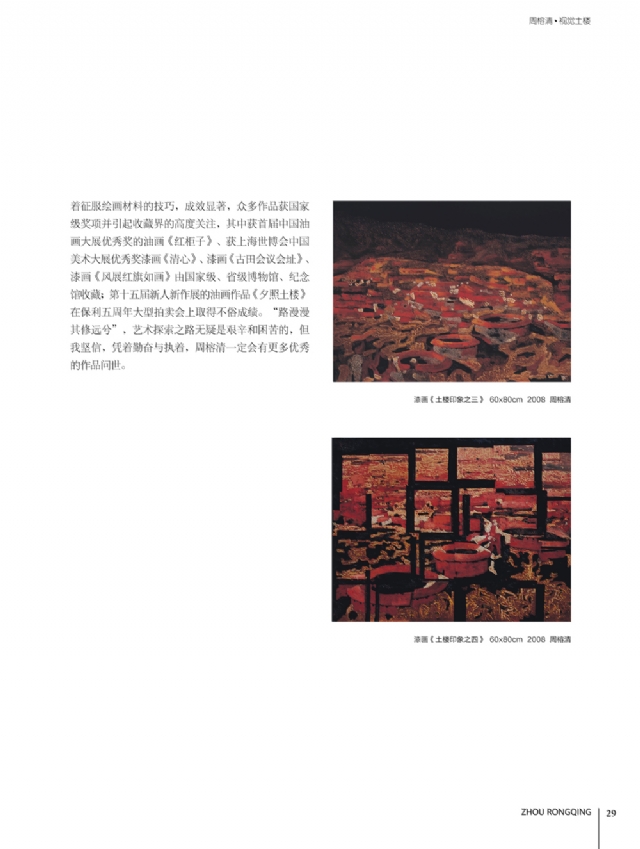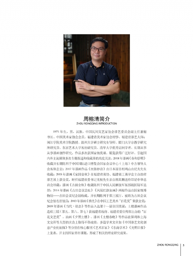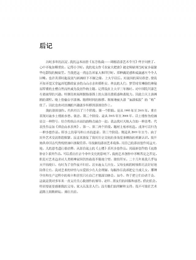 歷時多年的沉淀,我的這本畫冊《東方收藏一周榕清漆藝術??方K于問世了心中不免如釋重負。記得小學時,我的處女作《農(nóng)家大肥豬》被老師貼到當時家鄉(xiāng)最繁華電影院的櫥窗里,當我把這一消息告訴家人和同學時,那種滿足感和成就感至今令人回味,也許從那時起我就與畫畫結下不解之緣。上大學以后,對故園的深切眷戀,使我不知不覺又拿起畫筆描繪家鄉(xiāng)的山山水水和那樸實、善良的人們夢里時常神游的神秘而厚重的土樓自然而然成為我創(chuàng)作的主題。記得我在上大學三年級時,對中國民間漆藝有著濃厚的興趣,特別喜歡福州脫胎漆器上的大漆高貴質(zhì)感和表現(xiàn)力,因此白天上油畫班的課程,晚上偷偷自學漆畫,隨著時間的推移,漸漸地被大漆“如漆似膠”的“粘住了。因此也由對油畫的興趣逐步轉(zhuǎn)移到漆畫創(chuàng)作上。