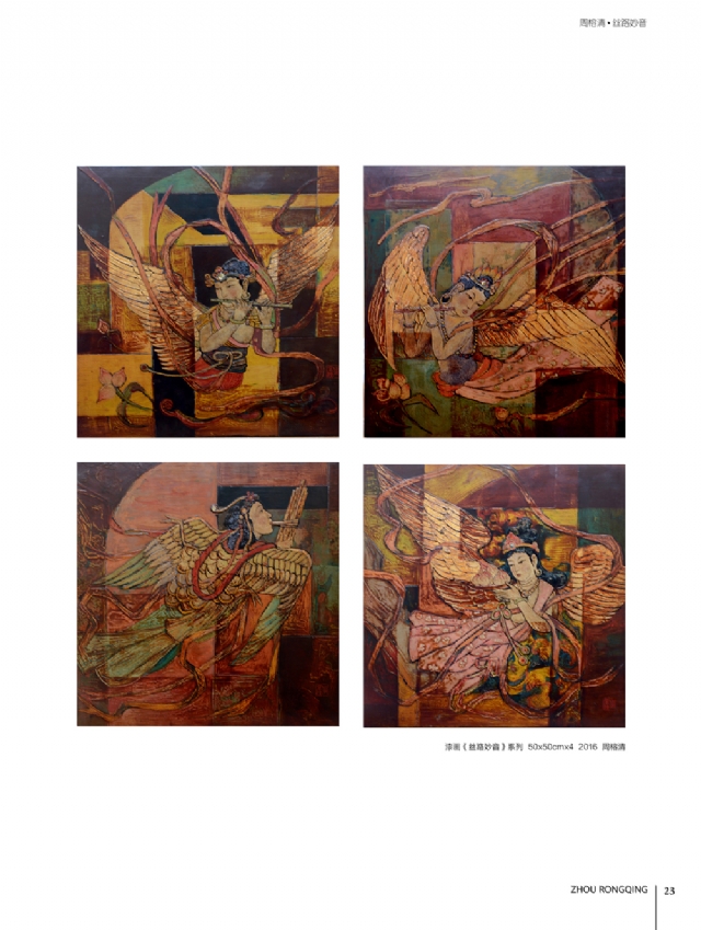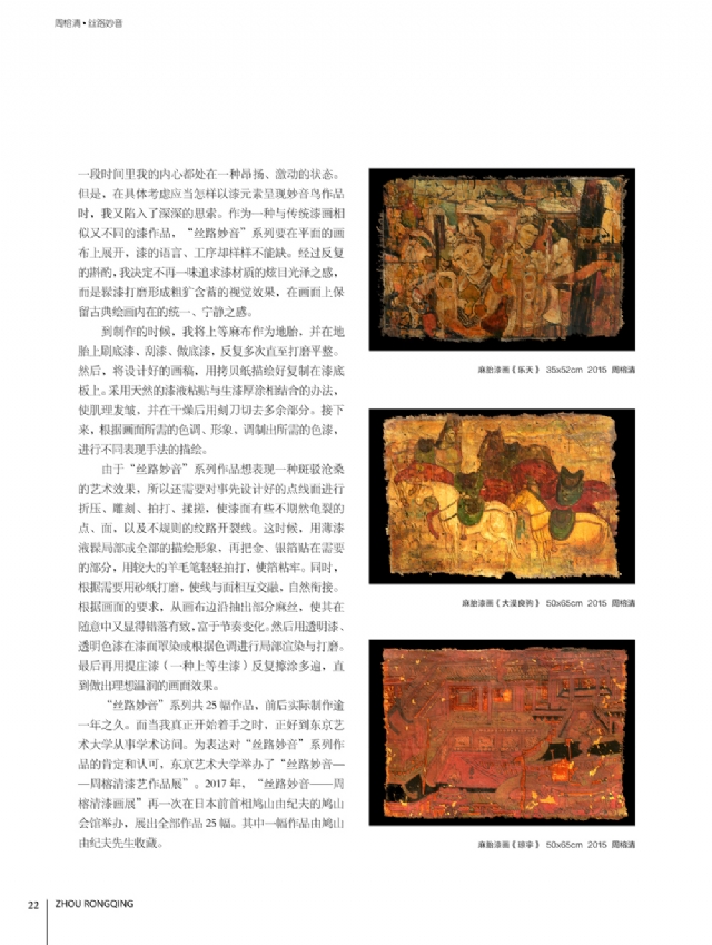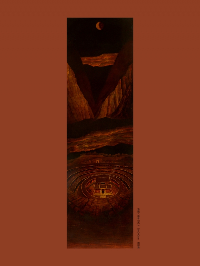我的漆畫創(chuàng)作,約共經(jīng)歷了三個階段。第一個階段,是從1993年至2006年,重在表現(xiàn)對故鄉(xiāng)土樓的鄉(xiāng)愁、依戀。第二個階段,是從2005年至208年,以土樓作為繪畫語言一種符號,結合傳統(tǒng)山水畫的的特點融合一起,表達我對天地人合的一種思考,代表性作品如《禪意山水系列》。第一、第二兩個階段,題材上相承相連,或許可以歸為種鄉(xiāng)愁作品,即鄉(xiāng)士的摹寫和山水的思索。第三個階段,則是從20年至今。由于對外藝術交流漸趨頻繁,反過來激發(fā)了我對歷史文化的多角度多側(cè)面的重新認識,我開始從中國古代傳統(tǒng)壁畫中汲取營養(yǎng),尋找新的漆畫藝木載體,用自己的漆畫創(chuàng)作對這天、地、人的思考進行著詮釋。從源自故十的《土樓》系列鄉(xiāng)愁作品,到最新創(chuàng)作的《絲路妙音》系列作品,可以看出在占今中外文化的影響下,我的藝術創(chuàng)作中不斷否定之否定,但是對藝術追求對人類精神家回仍然孜孜不倦地守望。激情所至,二十幾年來我?guī)缀趺刻煸绯鐾須w,有時為了創(chuàng)作夜不歸宿,甚至連女兒出生、父母生病的時候都無法好好地陪伴左右。我對藝術的鐘情與至愛很少有人會理解,每幅作品我都把它當成兒女,那種孕育和生產(chǎn)過程中的艱辛和喜悅只有自己才能深切體會。如今,終于把它們公諸于眾這就是我對多年來一直支持關心我創(chuàng)作的領導、老師、朋友們的回報和感恩。借此機會特別要還要感謝我的父母、家人以及親人們,沒有他們的理解和支持,我不可能在藝術道路上默默耕耘、勇住直前。