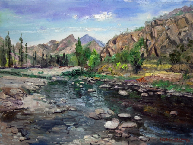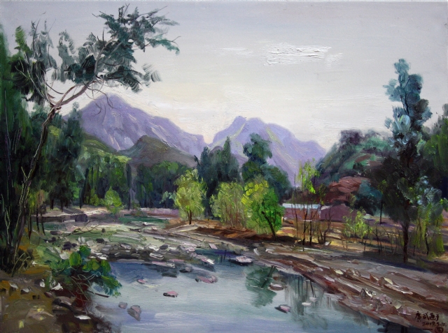 《河谷春色》布面油畫,作者:石廣武,尺寸:60X80(CM)
