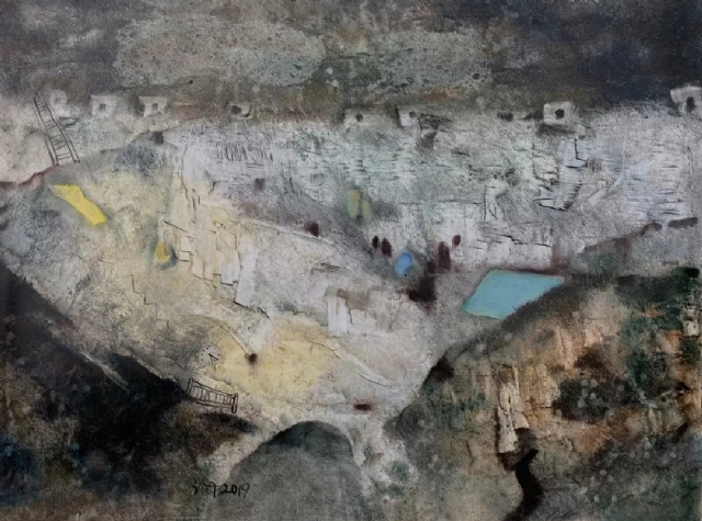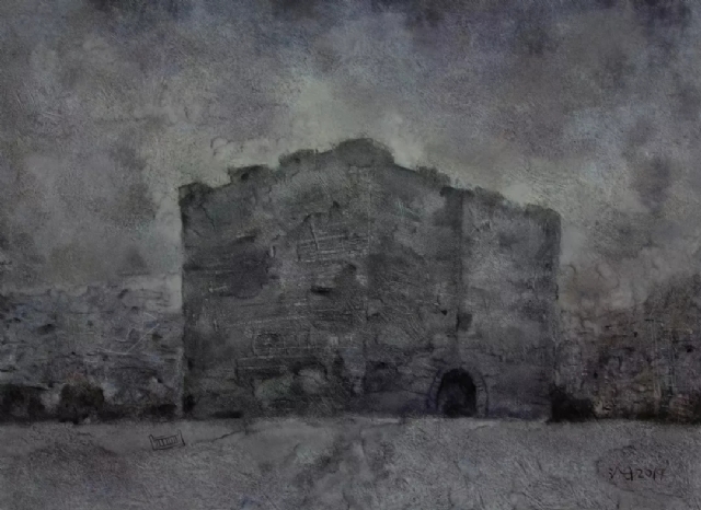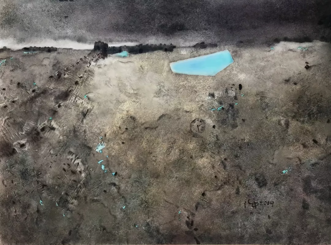 于是,在這幅畫(huà)面上就出現(xiàn)了那一塊藍(lán)色的東西,這塊藍(lán)色懸那么突兀,與整幅色調(diào)格格不入,是天泉嗎? 是天鏡嗎? 是與滿(mǎn)是傷痕的斑駁的對(duì)比抑或是反諷?是對(duì)歷史紛繁與理想單純的深刻隱喻?
