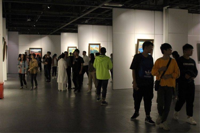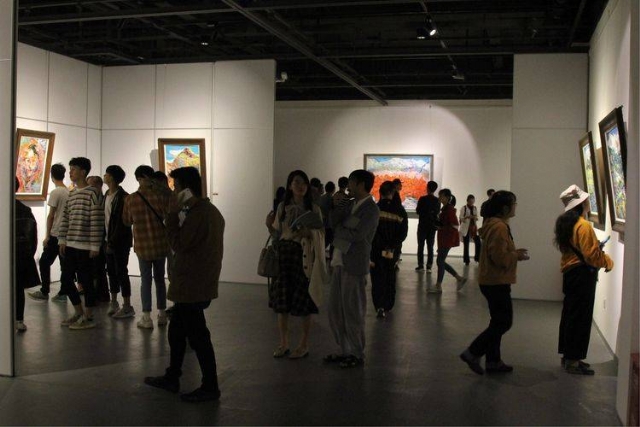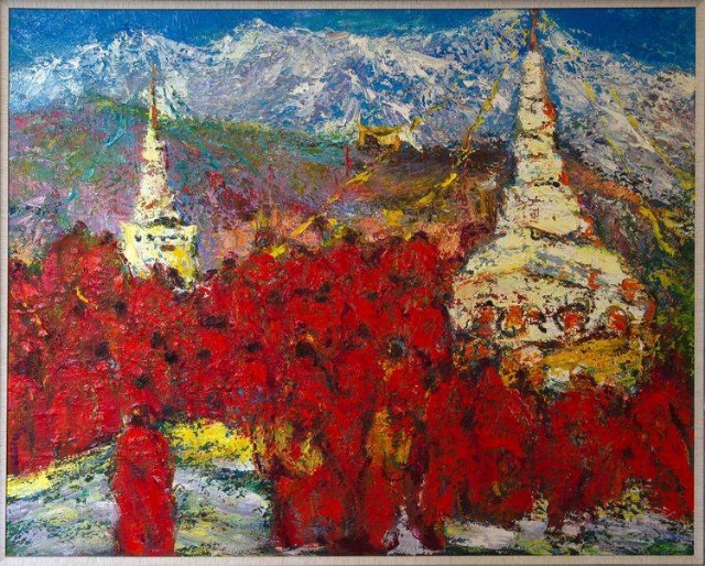 畫面中,聚焦部分的色彩多是斑斕與濃烈,充滿著激情與張力。而背景部分的色彩總是協(xié)調(diào)與沉穩(wěn),充滿著寧靜與謙和。站在作品前,恍然耳邊回蕩著佛音環(huán)繞環(huán)境忽然安靜下來,一片悠揚(yáng)清遠(yuǎn)……