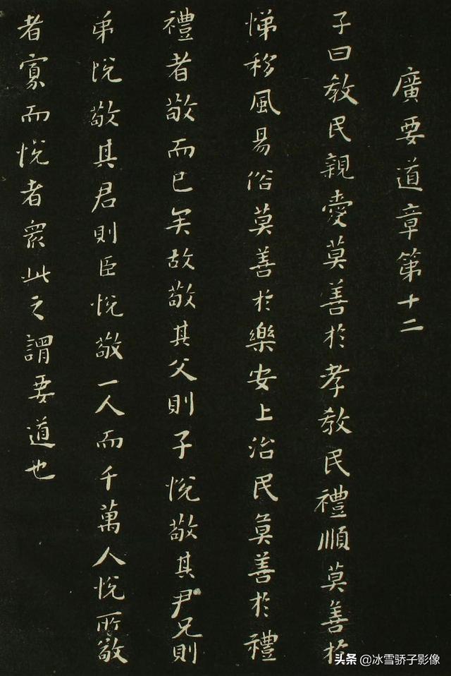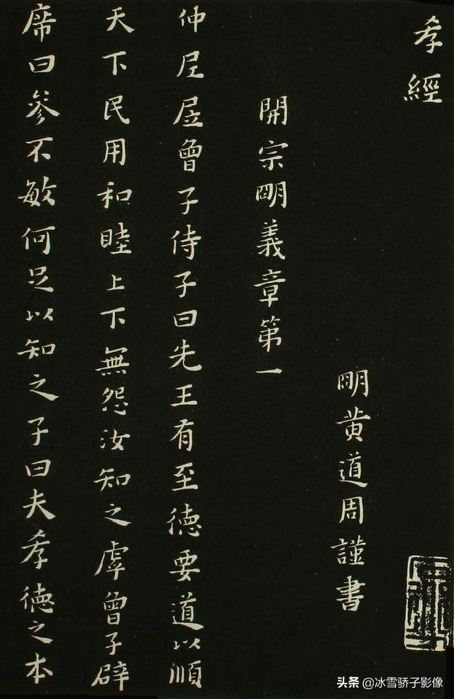 黃道周的小楷師法鐘王,質(zhì)樸自然,結(jié)體平中寓奇,用筆峭厲方勁,畫短意長,顯得骨格蒼凝,一變趙董妍媚之風(fēng)。清宋犖《漫堂書畫跋》評曰:“石齋先生楷法尤精,所謂意氣密麗,如飛鴻舞鶴,令人叫絕。”黃道周的小楷在章法有布局上亦別具一格,字距緊,行距松,加上他的用筆極豐厚質(zhì)樸,獨標氣骨,這對明季書學(xué)競尚柔媚的時俗之風(fēng)的確是很有反叛精神的,從中亦可以看出他強烈的藝術(shù)個性。黃道周所書的《小楷孝經(jīng)》大約是清代的拓本,有光緒16年(1890)跋。