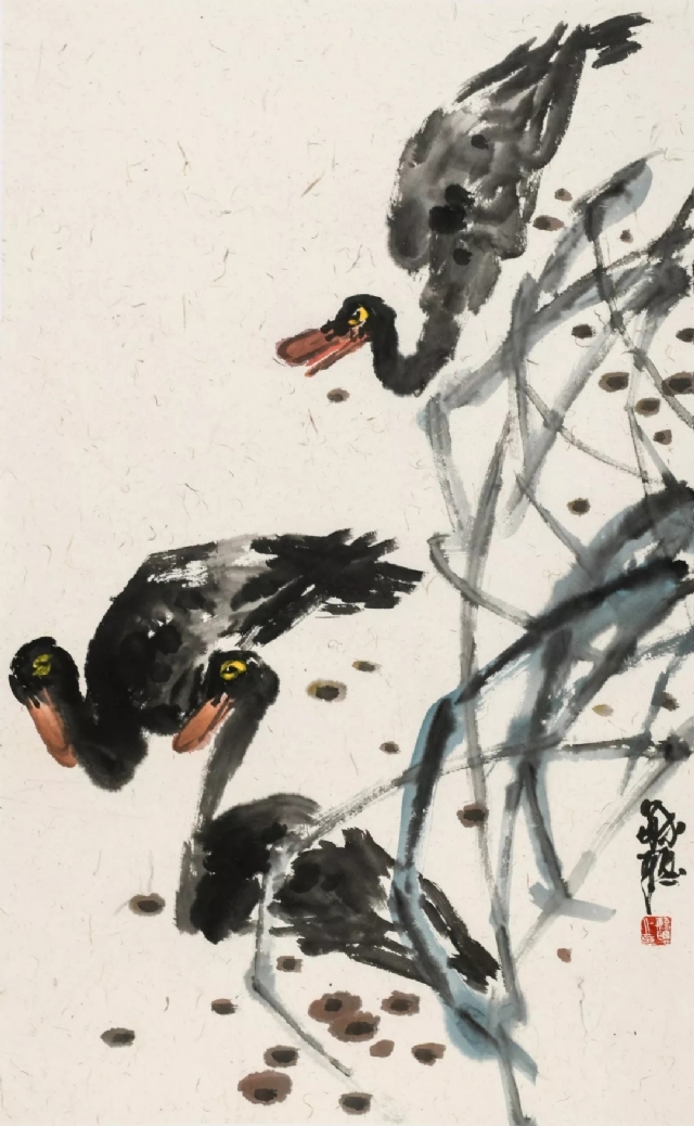 莊毓聰先生是當(dāng)代畫壇大寫意花鳥畫領(lǐng)域的代表性人物。莊毓聰?shù)拇髮懸饣B畫,顯然應(yīng)歸于金石派大寫意花鳥畫這一脈。這一脈繪畫,從清中期金石學(xué)盛行影響到文人繪畫之后,逐漸成為近現(xiàn)代花鳥畫主流。它不僅改變了中國書畫的面貌,而且改變了人們看畫的眼光,在“西學(xué)東漸”的國際語境中讓中國書畫有了主體的自信,并立定了文化的腳跟。