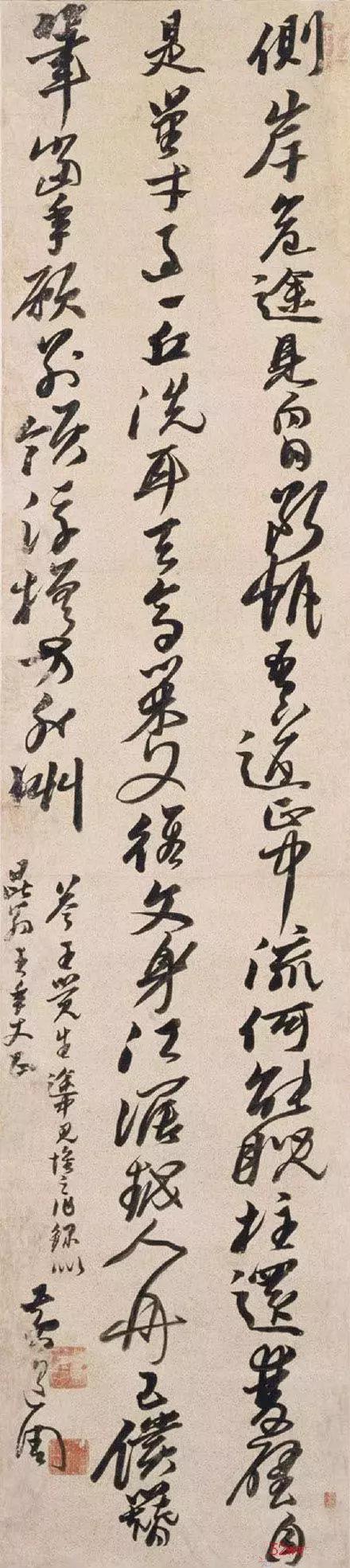 他的書(shū)法擅長(zhǎng)楷書(shū)、行書(shū)和草書(shū)。他的行書(shū)和草書(shū),行筆轉(zhuǎn)折剛勁有力,體勢(shì)方整,書(shū)風(fēng)雄健奔放,略顯狂野。有力量,又有姿態(tài),是黃道周行草書(shū)的主調(diào)。他以隸書(shū)鋪毫和方折行筆,點(diǎn)畫(huà)多取隸意;字雖長(zhǎng),但強(qiáng)調(diào)向右上橫勢(shì)盤(pán)繞,讓點(diǎn)畫(huà)變得綿而密,雖略帶習(xí)氣,但奇崛剛勁,形成了自己獨(dú)特的形式語(yǔ)言,尤顯出其人剛直不阿的個(gè)性。